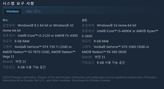 Romero Games와 Paradox Interactive가 선보이는 Empire of Sin은 금주법 시대인 1920년대, 무자비한 범죄가 들끓는 시카고 암흑가를 배경으로 펼쳐지는 새로운 전략 게임입니다. 알 카포네, 스테파니 세인트 클레어, 골디 가르노 등 실존했던 또는 가상의 마피아 보스 14명 중 한 명이 되어 조직원들을 규합해 나만의 범죄 제국을 구축 및 관리하고 라이벌 조직으로부터 영역을 지켜내세요. 모든 것은 플레이어에게 달려 있습니다. 속임수, 포섭, 위협 등 수단과 방법을 가리지 말고 정상의 자리를 차지하세요. 그럼 행운을 빌겠습니다!