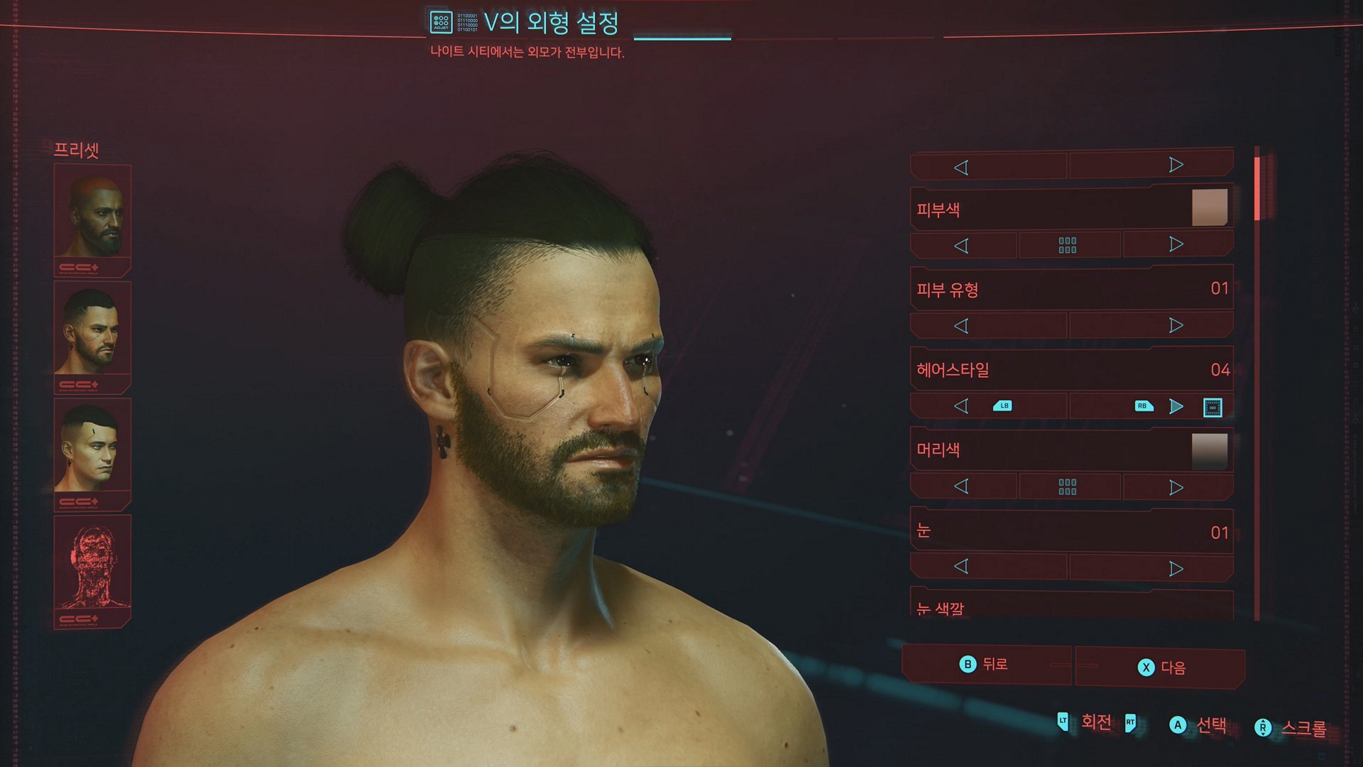 주인공 V의 성별 선택 화면과 다양한 외형 설정 & 의상 선택 화면