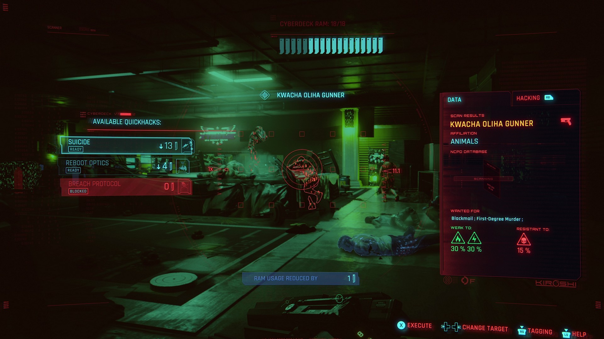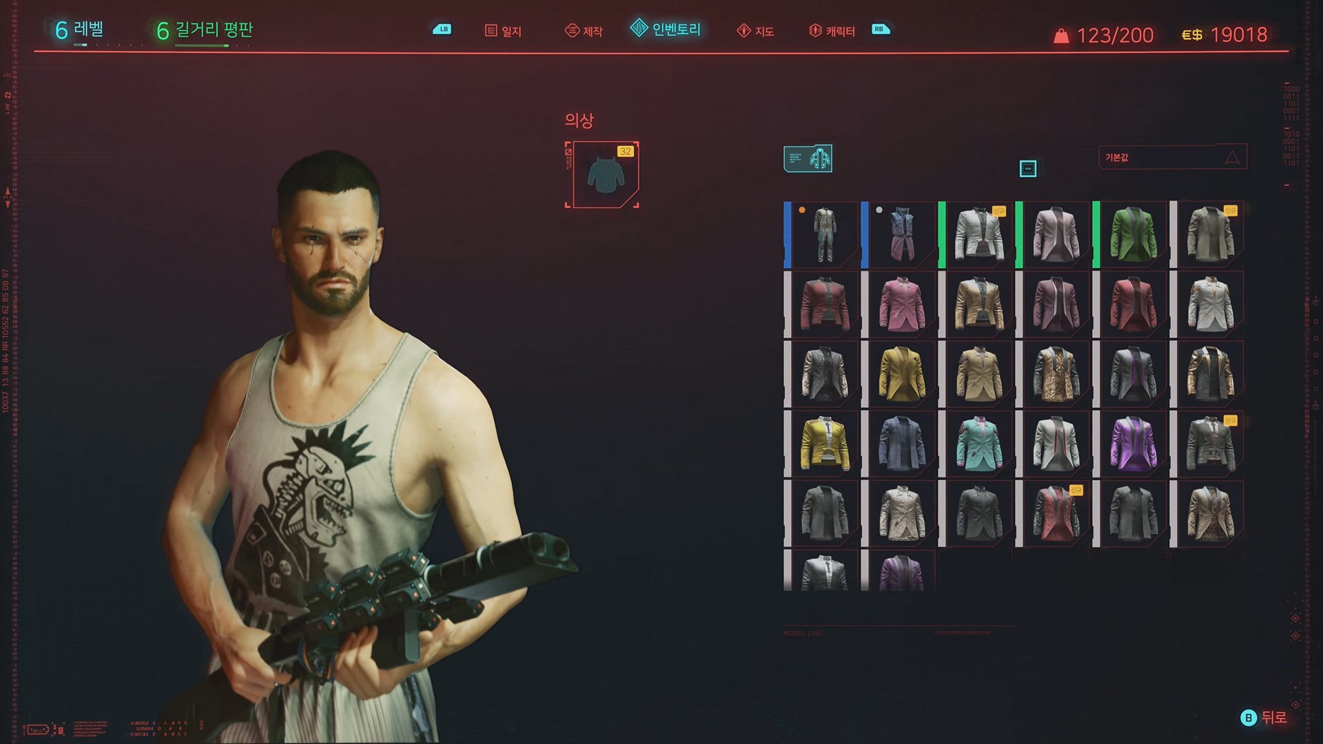 각종 사이버 웨어 설정과 무기 스킬 트리 및 특전 UI 화면