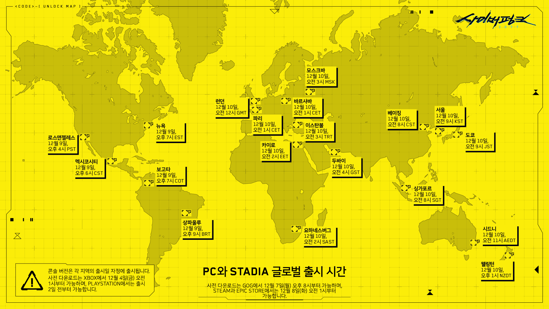 - 모든 콘솔 버전은 출시일 자정에 출시, 즉 12월 10일 0시부터 플레이 가능.