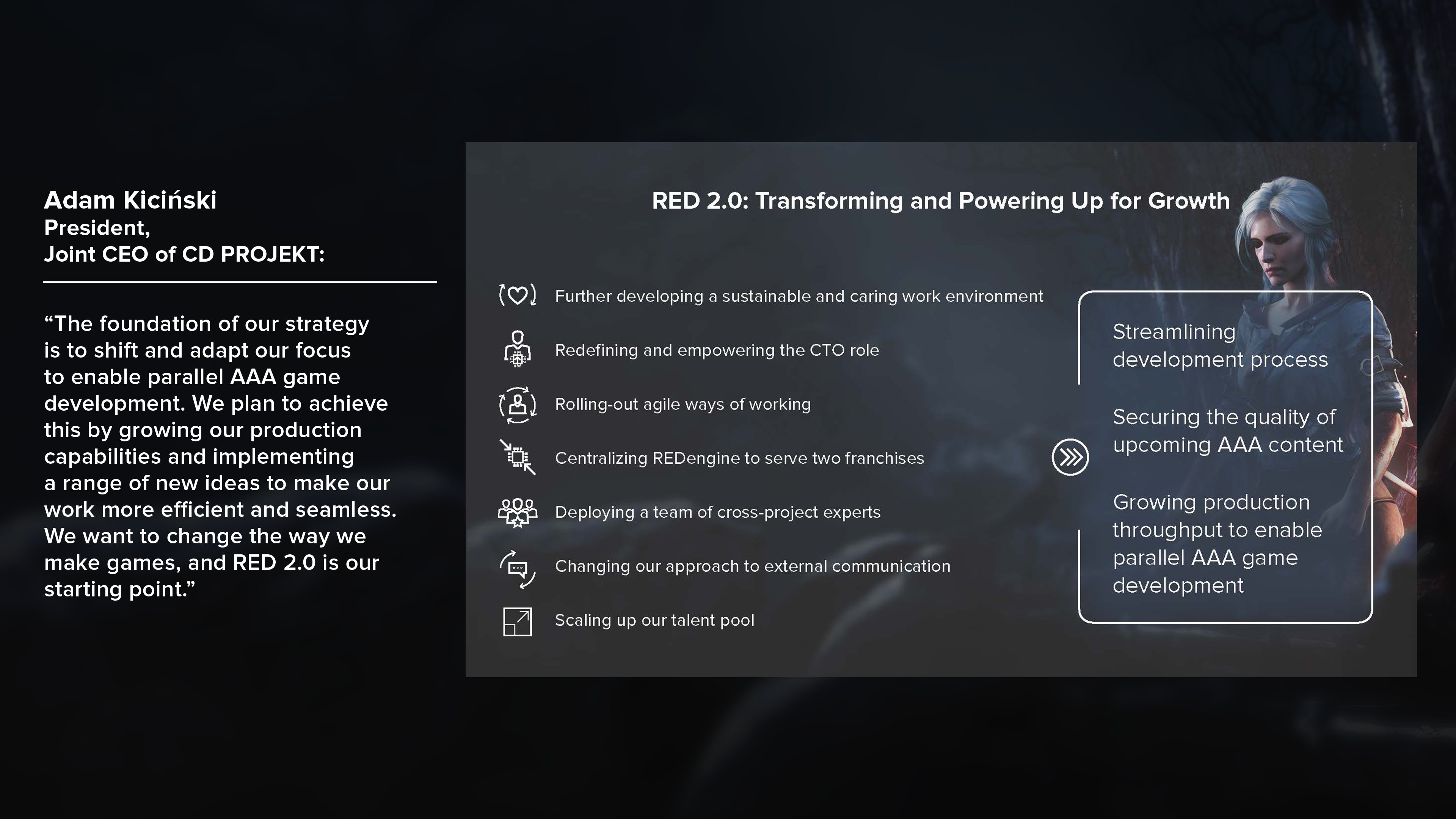 이번 향후 전략 발표에 따르면 「RED 2.0」이라고 불리는 새로운 개발 체재 전환을 필두로 개발 효율성을 높이고 직원의 확충, CTO직의 현대화, 작업 환경 개선, 자체 게임 엔진 'RED engine'을 중심으로 한 개발, 외부와의 마케팅 소통 변화, 등을 설명하며 스튜디오를 개선할 것이라고 밝혔습니다.
