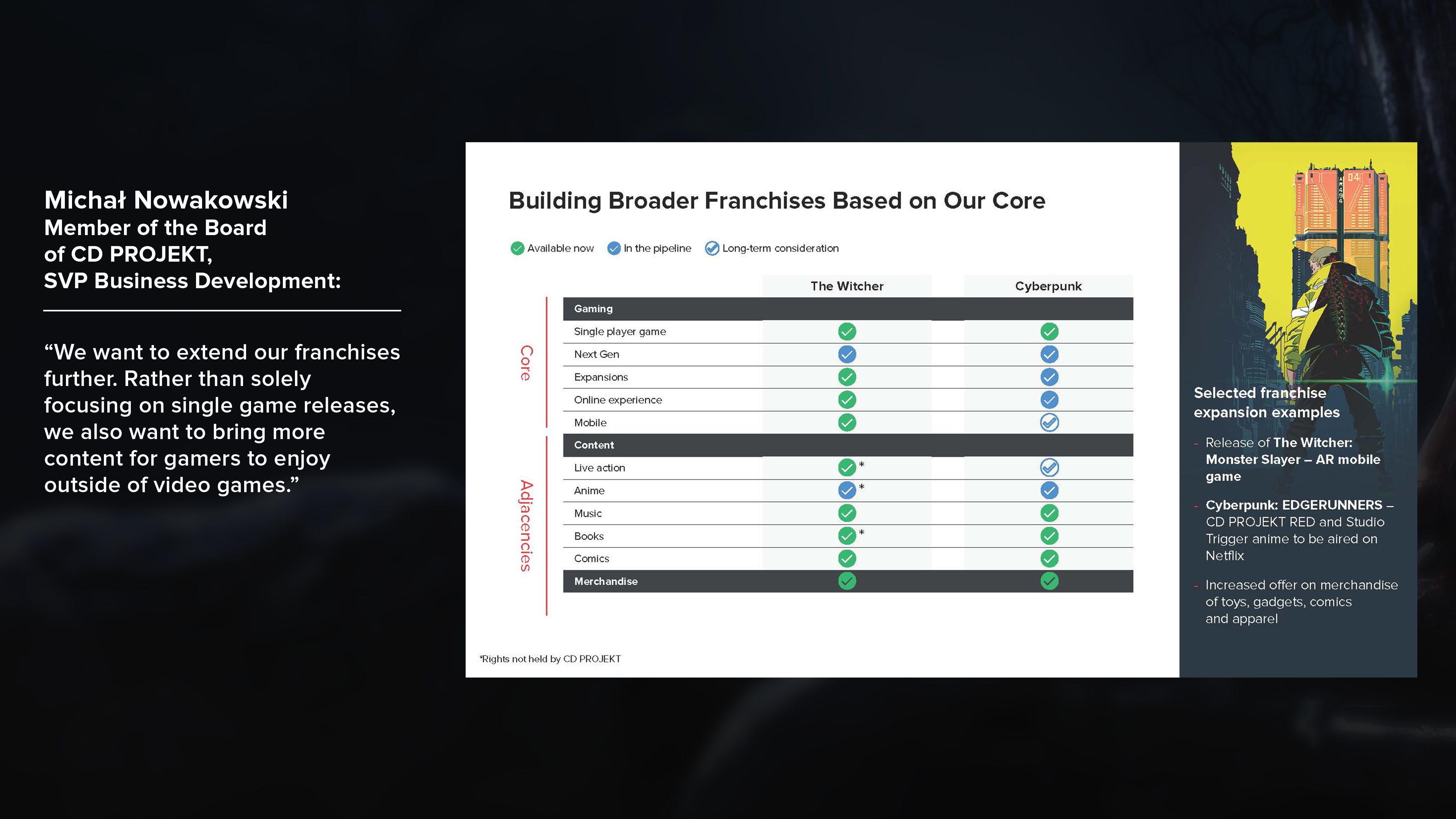 - 「더 위쳐」, 「사이버펑크」의 빌드 아웃 - 핵심 게임 확장(예: 모바일) 및 파트너십을 통한 프랜차이즈 가치 창출(예: TV 시리즈, 상품)
