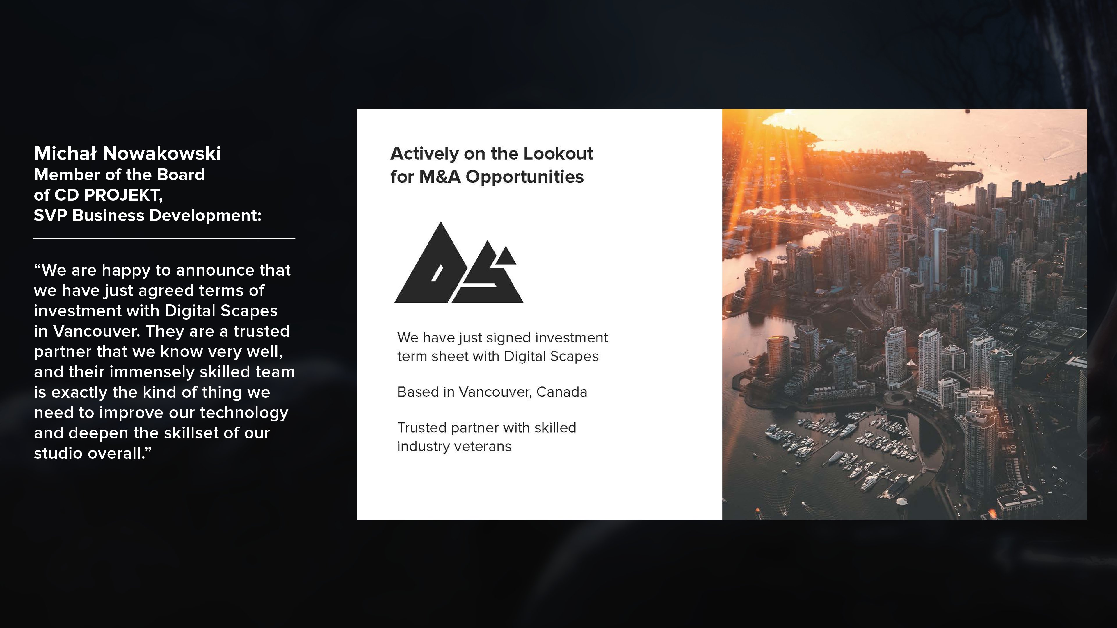 - CD PROJEKT는 새로운 전략 업데이트와 함께 '캐나다 디지털 스코프' 개발 스튜디오를 인수하는 서명도 발표했고, 양사는 2018년부터 활발하게 협업하고 있다. 또 이런 새로운 전략의 구현은 CD PROJEKT가 최근 몇 년 동안 확보한 탄탄한 재무 상황에 의해 가능해졌다.