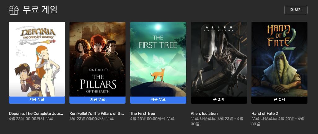 에픽 게임즈 스토어에서 포인트 앤 클릭 어드벤쳐 게임 3부작 합본판 < Deponia: The Complete Journey >, 켄 폴릿의 베스트 셀러 '대지의 기둥'을 원작으로 한 < Ken Follett's The Pillars of the Earth > 그리고 잃어버린 가족을 찾는 여우의 이야기를 그린 3인칭 힐링 어드벤쳐 게임 < The First Tree >총 3개의 게임을 2021년 4월 23일까지 무료로 배포 중입니다.