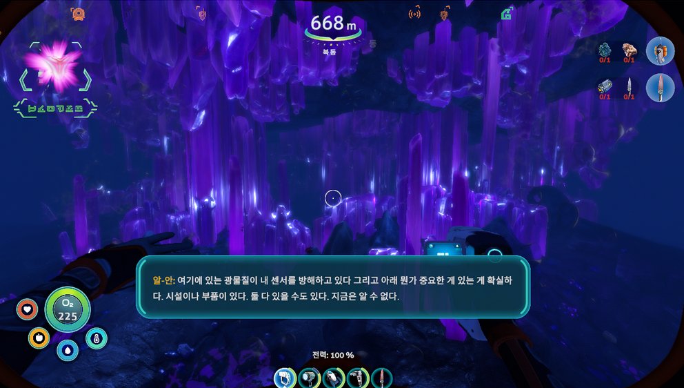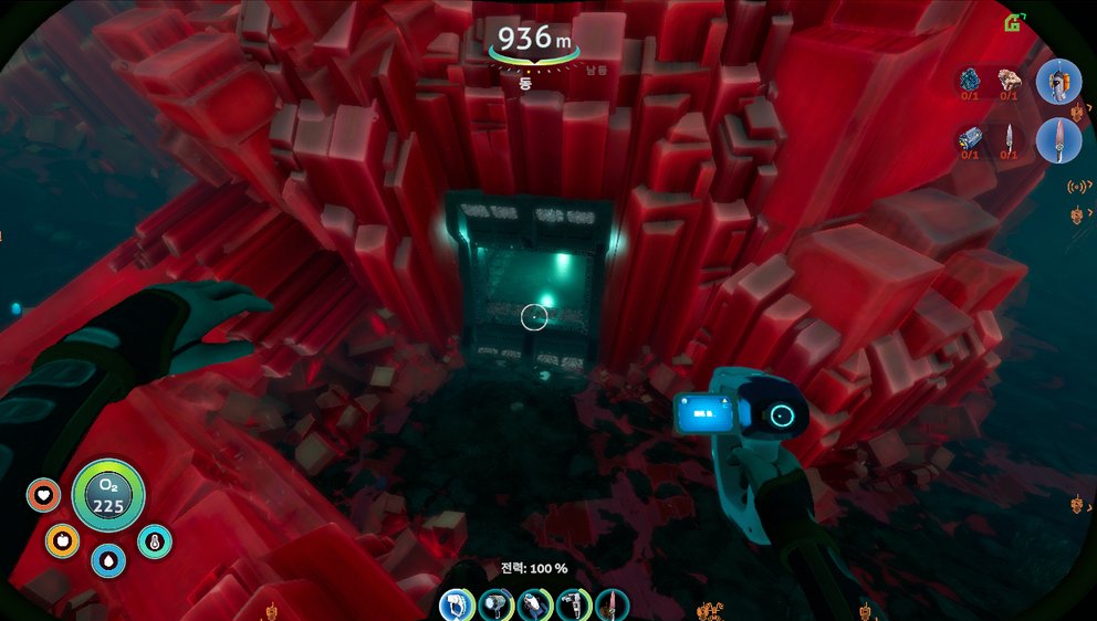 - 이제 수정 동굴로 이동해 마지막으로 Al-AN의 몸을 만드는 데 필요한 마지막 부품인 설계자의 장기를 찾아야 한다. 갈 곳은 수심 800m 가까이 내려가므로 1,000m까지 견딜 수 있는 '시트럭 수심 업그레이드 Mk3'를 장착하자. 또한 '시트럭 주변 방어 업그레이드'가 되어 있으면 편하다.
