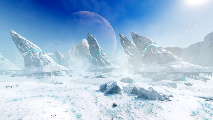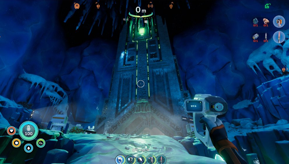 - 설계자의 조직: 설계자의 조직을 찾기 위해 빙하 분지에서 다리로 연결된 빙하첨탐을 탐색해야 한다. 체온 회복 수단이 많지 않은 지역이기 방한용 슈트 / 방한용 장갑 / 방한용 헬멧을 제작하고 빙하 분지의 다리를 수리하자. 다리 앞에서 '파열된 유압액' 입수하고 제작기에서 '유압액'을 만들고, 다리에 설치한 뒤, 터미널에서 다리 컨트롤 확대를 클릭하면 다리가 연결된다. 빙하첨탑은 레이아탄 얼음벌레(아이스웜)이 지배하는 영역으로 계속해서 주인공을 공격해오는 지상 지역이다.