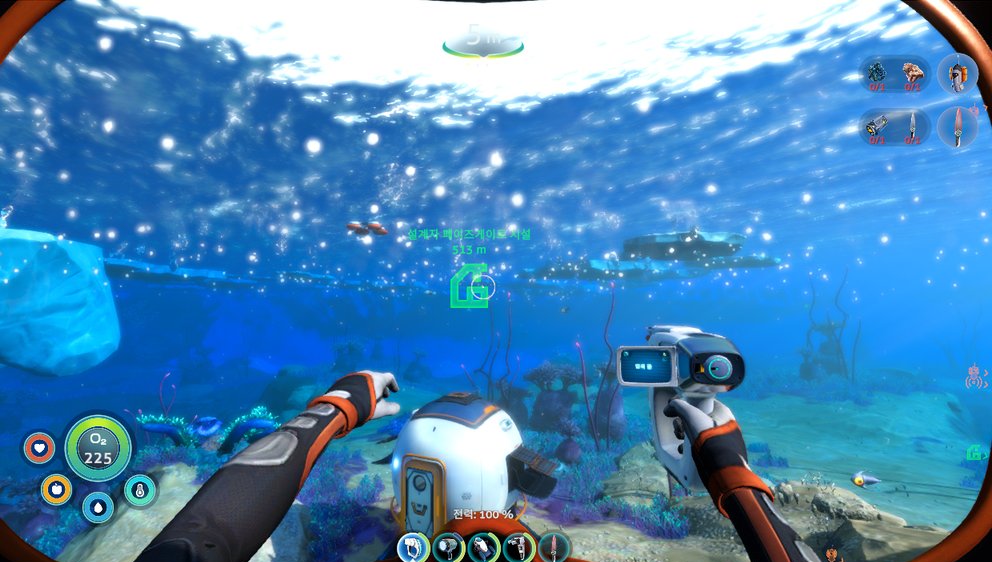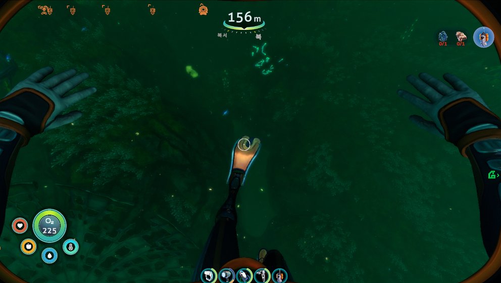 - 장비 및 도구의 제작 - 게임 시작 직후에는 아무런 장비나 도구가 없어 바닷속에서의 행동이 제한되어 있다. 가장 먼저 만들어야 할 장비는 '스캐너', '생존 칼', '산소 탱크'와 '물갈퀴'다. '스캐너'는 바닷속에 있는 대상의 세부 정보를 입수하거나, 건설 아이템 / 제작 아이템 파편들을 스캔하여 모두 입수하면 직접 만들 수 있게 된다. 게임 내에 아주 많은 아이템이 있으므로 스캔으로 제작하는 것은 필수 콘텐츠라고 볼 수 있다. 그 외 '칼'은 우클릭으로 사용해 해조류를 입수할 수 있고, '산소 탱크'를 장비하면 물속에서 오래 행동할 수 있게 되며, '갈퀴'는 수영이 조금 빨라지기 때문에 행동 범위가 넓어지고 물고기도 잡기가 쉽다.