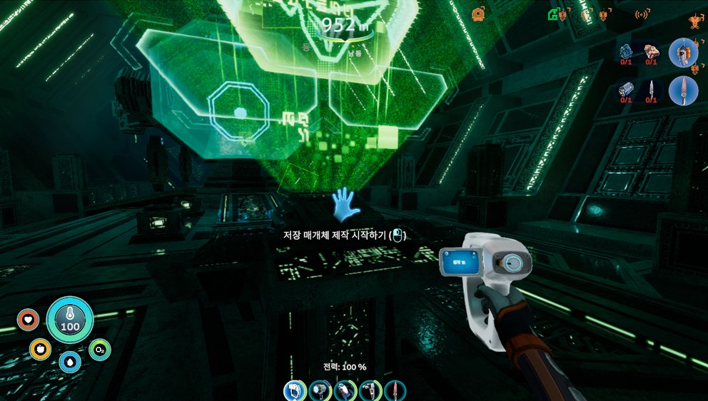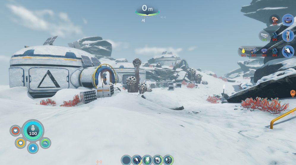 - 게임이 시작되면 불시착 한 우주선에서 나온 뒤 주위에 아이템을 줍고 주황색의 구명 포드 마크가 표시되는 쪽으로 달려가자. 참고로 옵션 -> 접근성에서 하이라이트를 활성화하면 입수 가능한 아이템이 밝게 표시된다. 구명 포드에 도착하면 제작기를 통해 아이템을 만들 수 있고 보관소에 아이템을 저장할 수 있다. 제작기를 통해 스캐너 / 생존 칼 / 표준 산소 탱크 / 물갈퀴 / 나침반 등 탐험에 필수적인 아이템들을 만들자. 모든 제작에 필요한 자원은 주변(50m 이내)에서 입수 가능하다.
