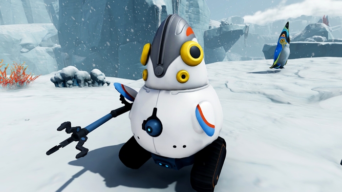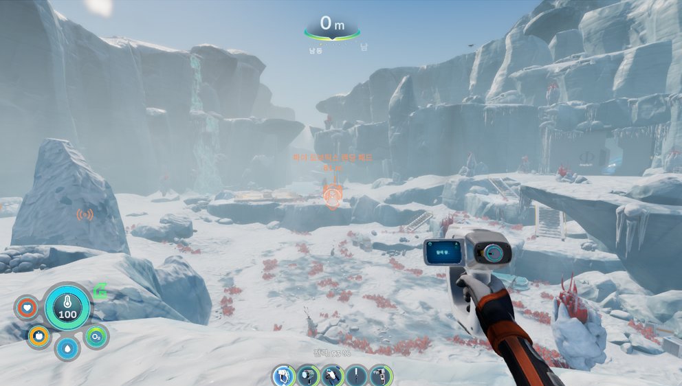 - 구명 포드에서 남서와 서쪽의 중간으로 약 1,000m에 위치한 빙하 분지 섬으로 이동하자. 부두에서 올라와 오른쪽으로 들어가면 '파이 로보틱스 랜딩 패드'가 위치가 화면에 표시된다. 육지에서는 온도 게이지가 계속 떨어지므로 동굴이나 증기 분출구를 만져 온도를 높이자. 파이 로보틱스 센터로 들어가면 오른쪽에서 '스노폭스용 호버패드' 왼쪽 계단을 타고 올라가면 '설계자의 텔레포트'를 스캔할 수 있다.