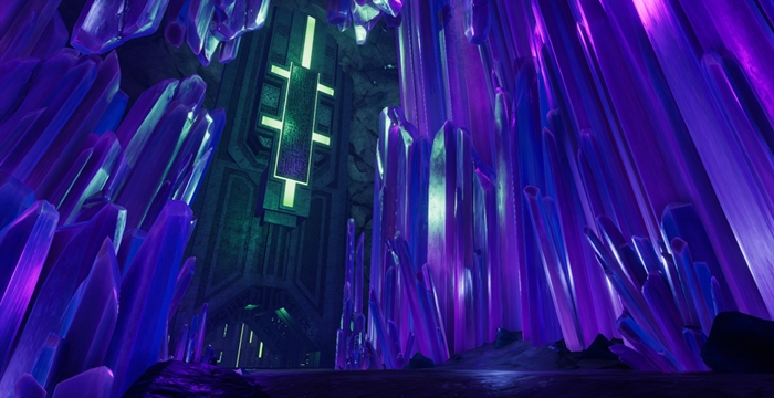 - 수정 동굴은 구명 포드에서 남동쪽으로 830m 이동 후에 수심 400m 가까이 내려가면 보라색 크리스탈로 가득 차 있는 지역이며, 레이아탄급 생물 '그림자'가 서식하고 있다. 아래로 내려가 크리스탈 가득 차 있는 외계 유적 입구를 발견하면 신호기를 세워놓자. 거대한 크리스탈 아래에서 설계자의 장기를 입수했으면 설계자 몸을 만들기 위해 아래의 재료를 모으자.