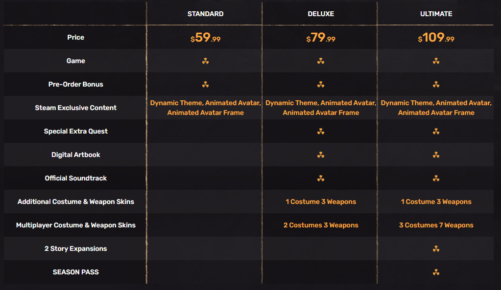 - 얼티밋 에디션 구성 내용: 「스토리 확장팩 2개를 포함하여 향후 모든 DLC에 접근할 수 있는 시즌 패스」, 「추가 스토리 기반 사이드 퀘스트」, 「싱글 플레이어: 의상 스킨 1개 & 무기 스킨 3개」, 「멀티 플레이어: 의상 스킨 3개 & 무기 스킨 7개」, 「디지털 아트북, 사운드트랙」