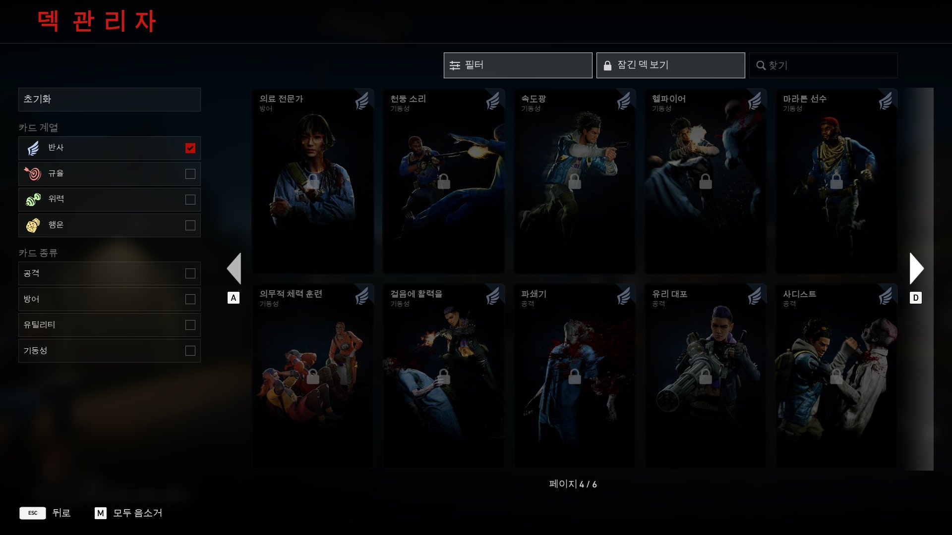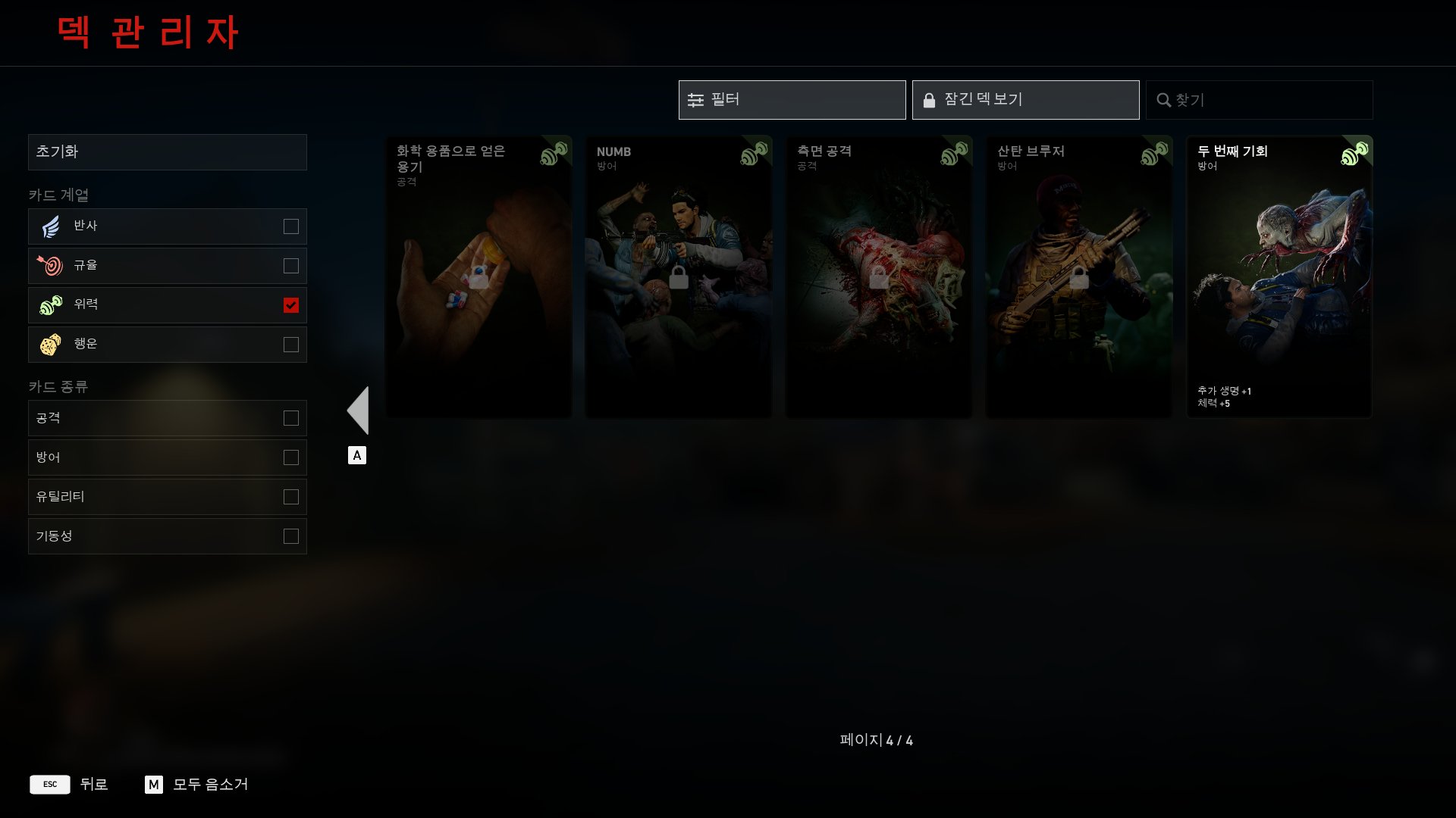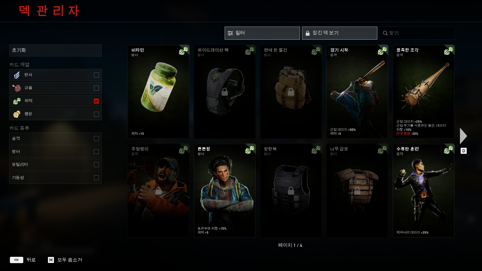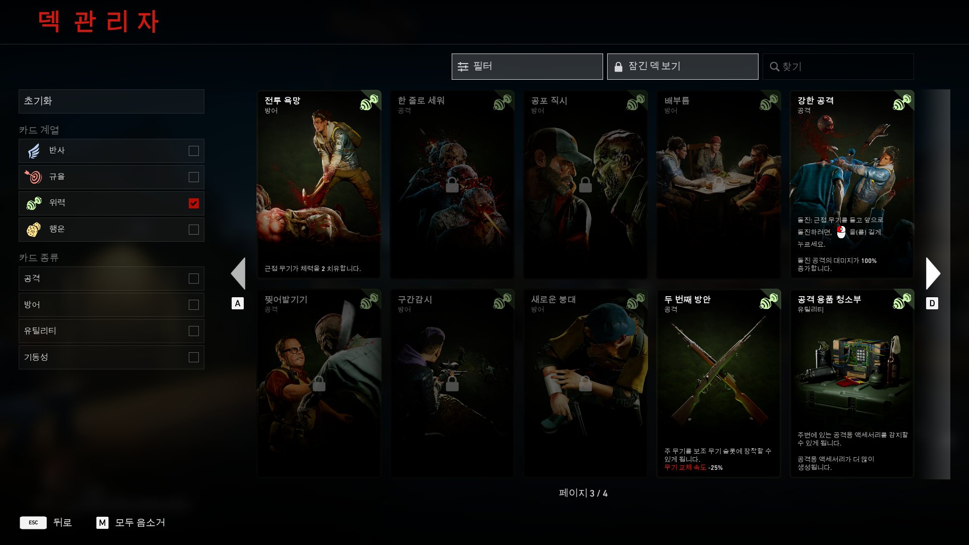■ 모든 활성 덱 카드(반사, 규율, 위력, 행운) 목록