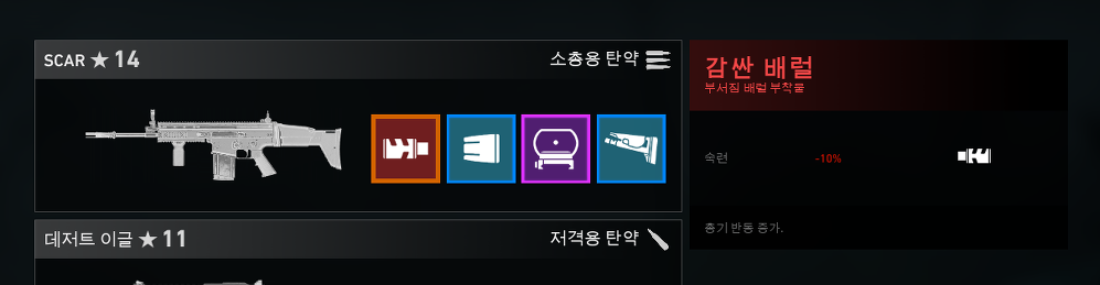 | 재장전 관리 | 공격 | 무기를 넣으면 재장전 탄약 용량 -15% |