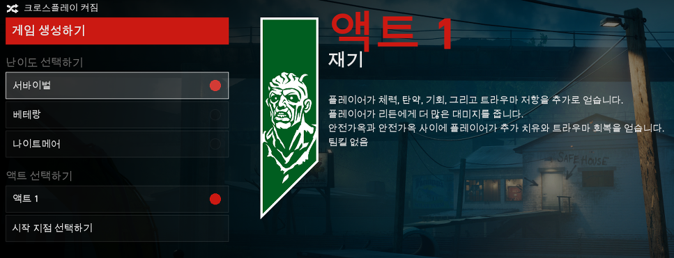 - 서바이벌 - 플레이어가 더 많은 체력, 탄약, 이어하기, 트라우마 저항을 추가 얻고, 리든에게 추가 대미지를 준다. 안전가옥(세이프하우스) 사이에 체력과 트라우마가 추가 회복된다. 팀킬: 대미지 없음