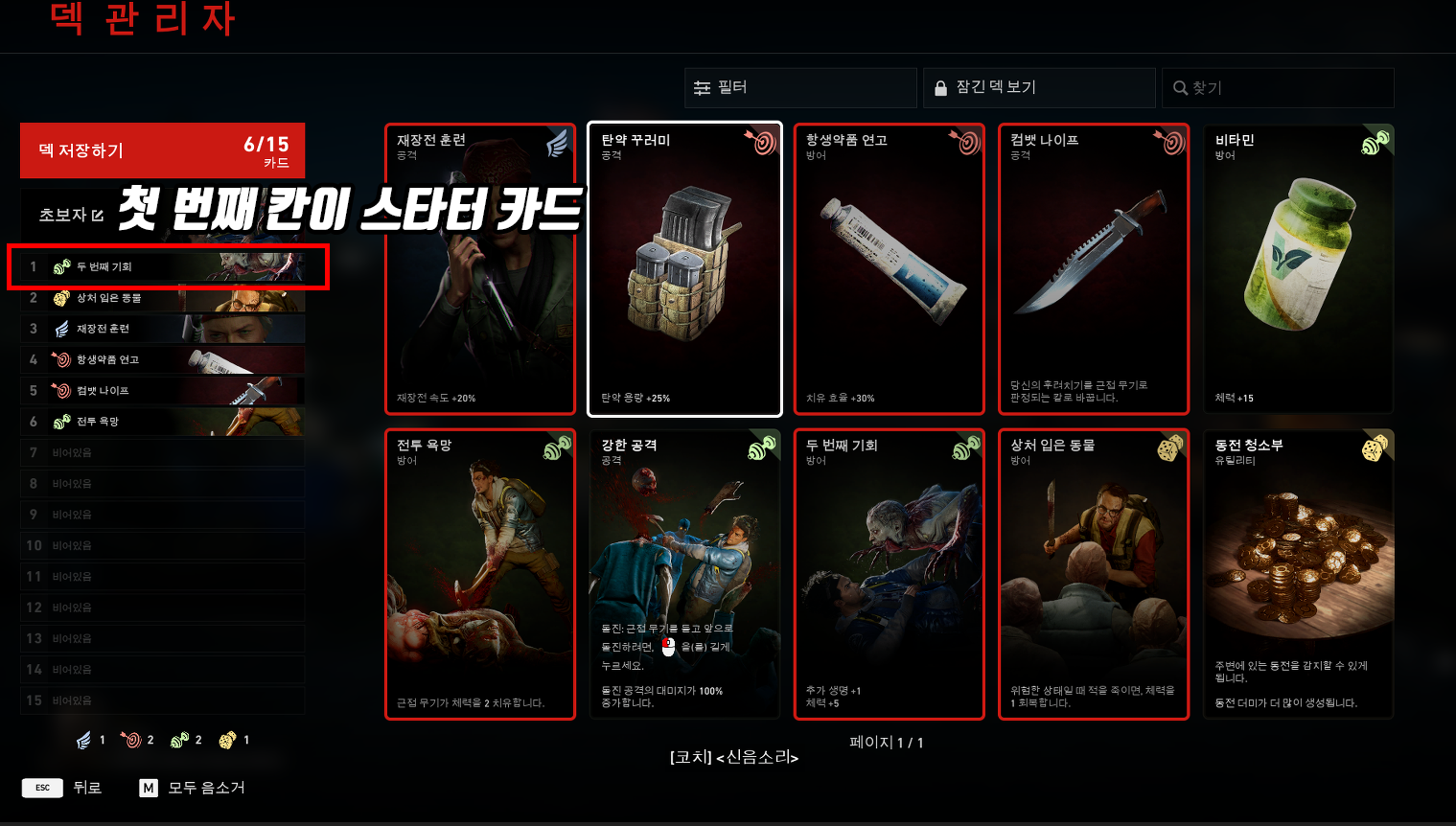 - 처음 추천 스타터 카드 - 15개의 카드 덱 구성시 맨 위의 카드가 스타터 카드로서 게임 시작시 무료로 활성화된다. 첫 플레이시 추천 스타터 카드는 기본 근접 공격을 나이프로 교체해주는 '컴뱃 나이프', 동전이 더 많이 생성되서 동전 파밍하기 좋은 '동전 청소부', 근접 공격시 체력이 +2 회복되는 '전투 욕망'
