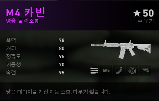 - 주무기와 보조무기(단축키 1, 2), 부착물(배럴, 시야, 탄창, 개머리판)