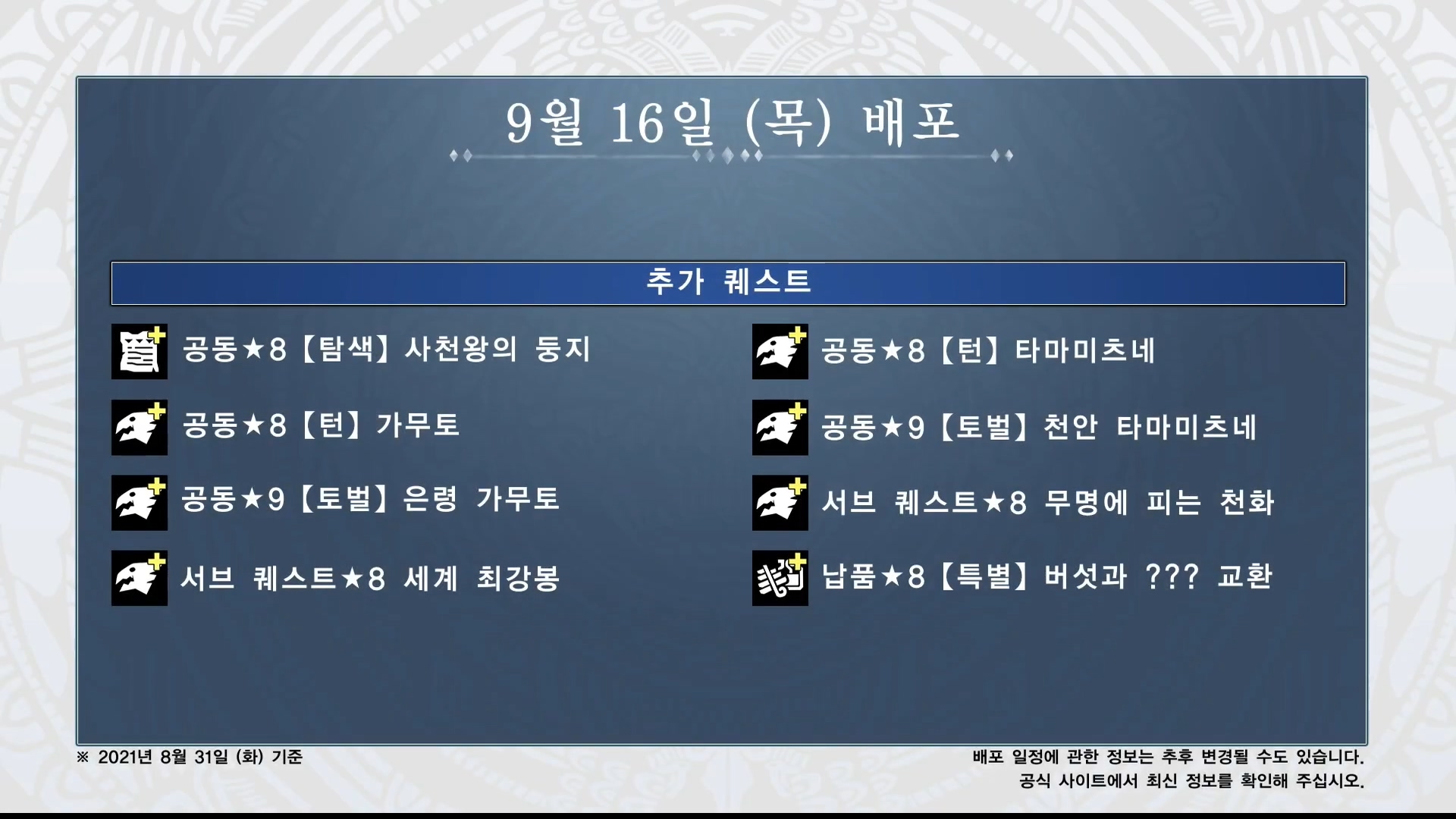 이번 무료 타이틀 업데이트 제3탄에서는 9월 2일에 새로운 동료몬 「키린 아종」, 「천안 타마미츠네」, 「은령 가무토」와 퀘스트가 추가, 9월 16일에 토벌 등의 또 다른 서브 퀘스트들이 추가될 예정입니다.