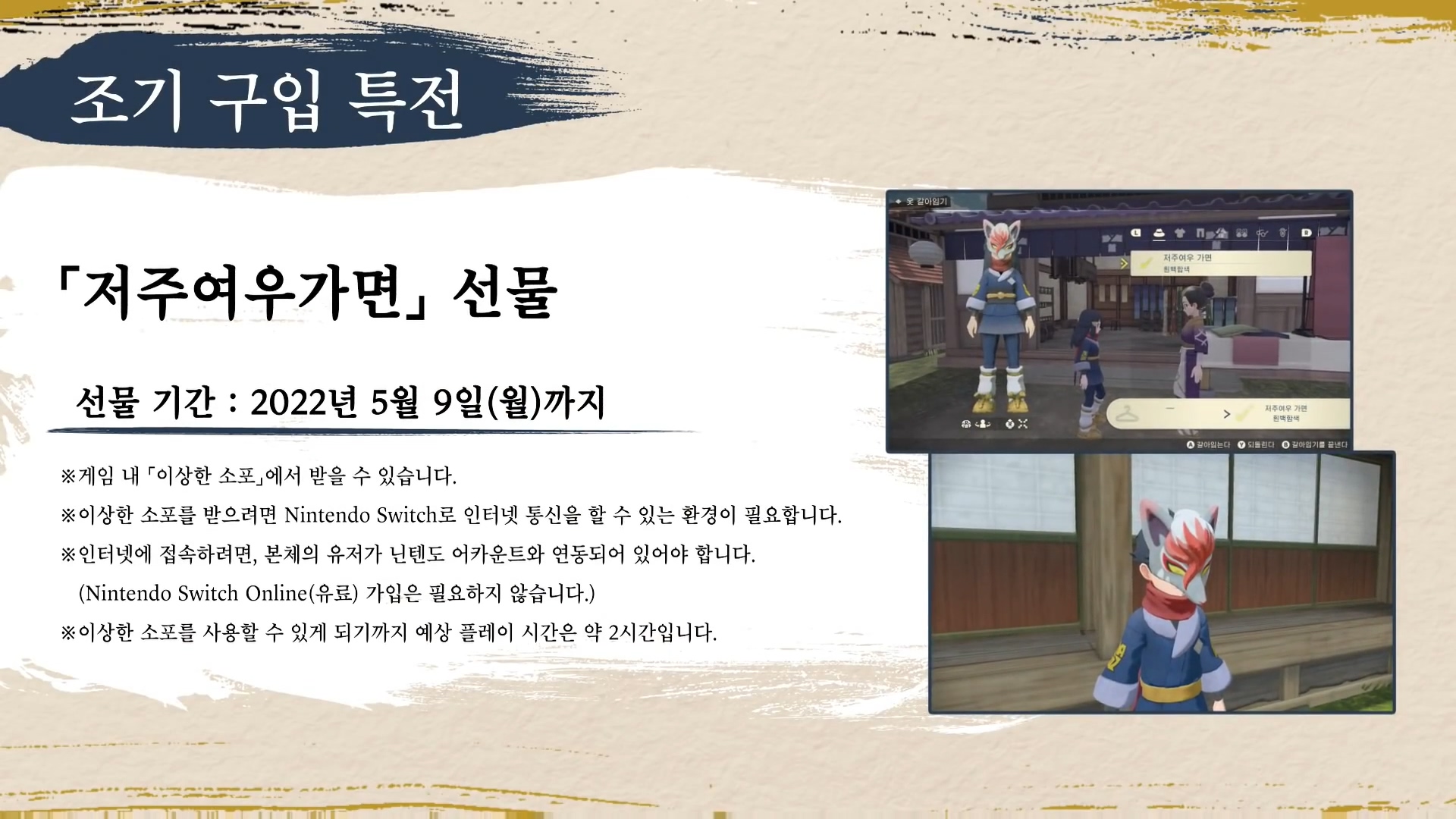 - 조기 구입 특전「저주여우 가면」 - 「Pokémon LEGENDS 아르세우스」의 조기 구입 특전으로, 이미 공개된 특전과 더불어 「저주여우 가면」을 선물로 드립니다. 2022년 5월 9일(월)까지, 게임 내 「이상한 소포」에서 「인터넷으로 받는다」를 선택하면 받을 수 있습니다. 조로아크(히스이의 모습)를 모티브로 하는 독특한 외형의 「저주여우 가면」을 쓰고, 히스이지방을 모험해 보시기 바랍니다.
