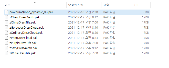 - 티파 차이나 골든 드래곤 드레스 - 티파의 '차이나 드레스' 복장 모드를 '골든 드래곤 블랙 드레스'로 교체해주는 모드입니다. 맨 위의 「zChinaDressTifa.pak」 파일을 먼저「End\Content\Paks\」폴더에 복사하고 「Zchinesedressdragon.pak」 파일을 복사하면 됩니다.