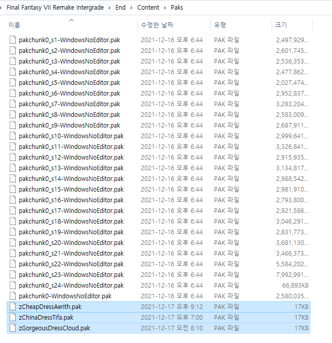 - 모드 설치 폴더: FFVIIRemakeIntergrade/End/Content/Paks