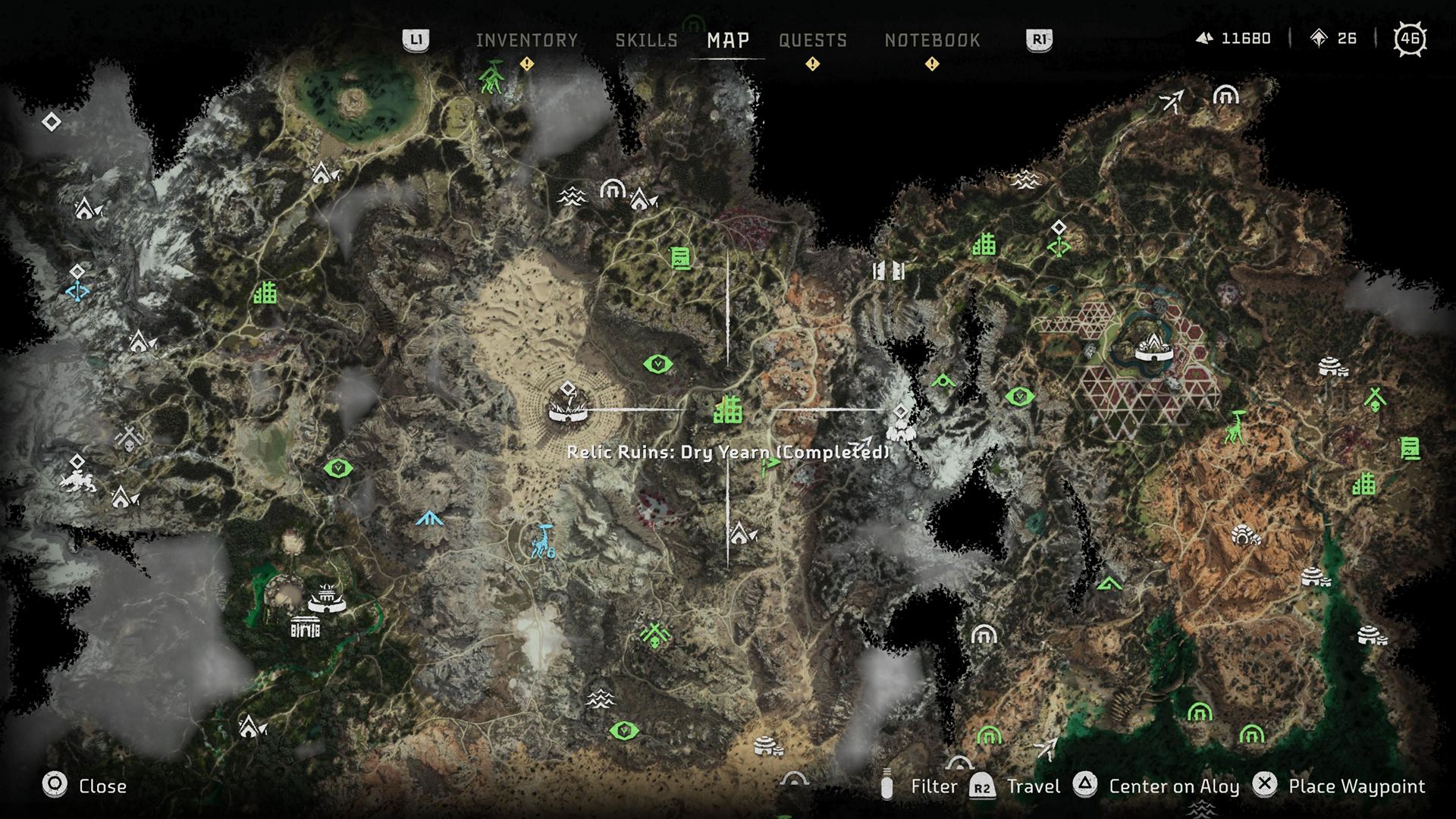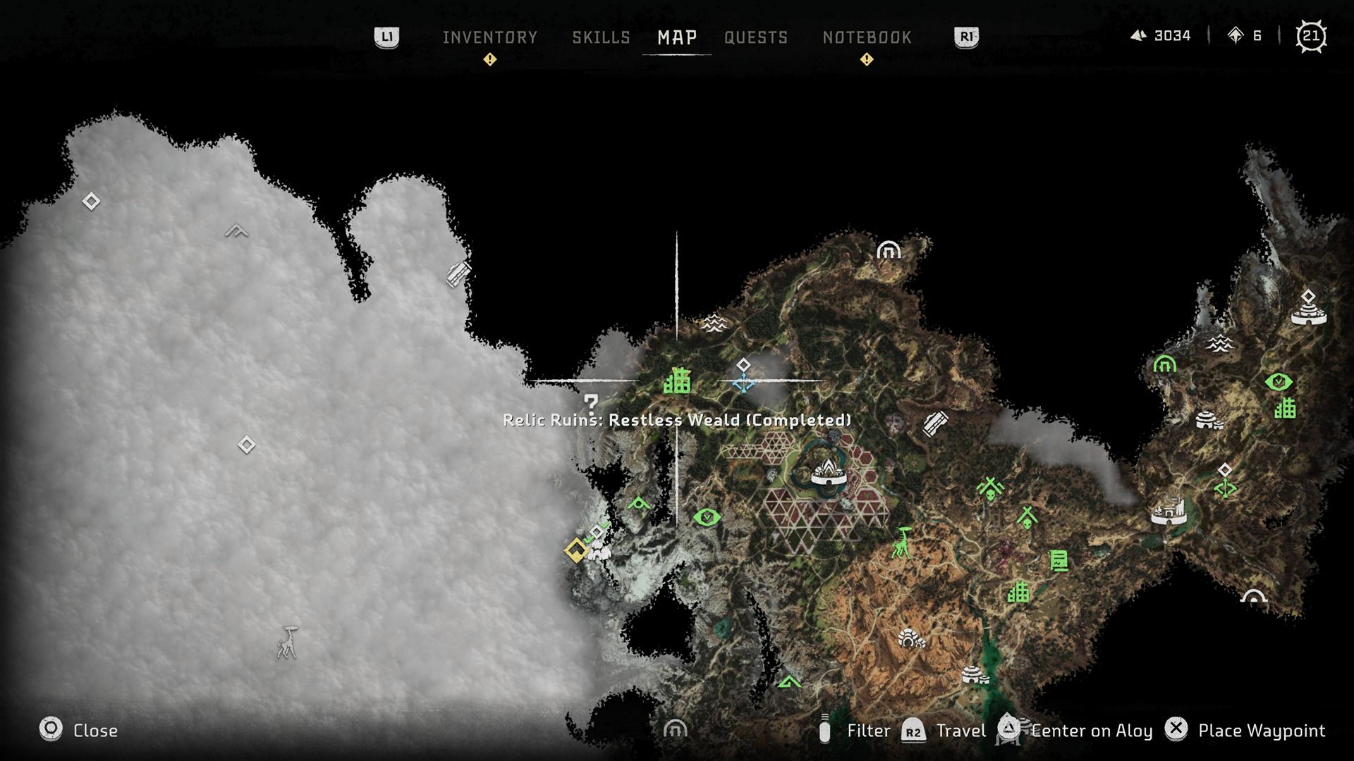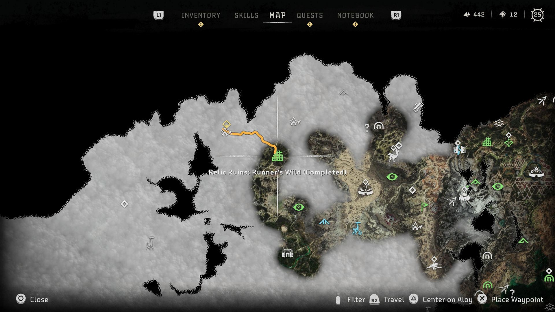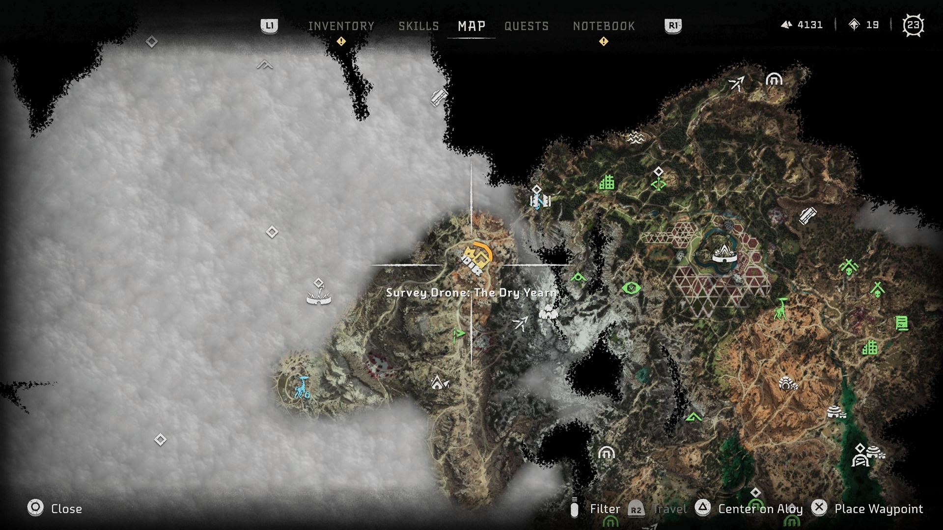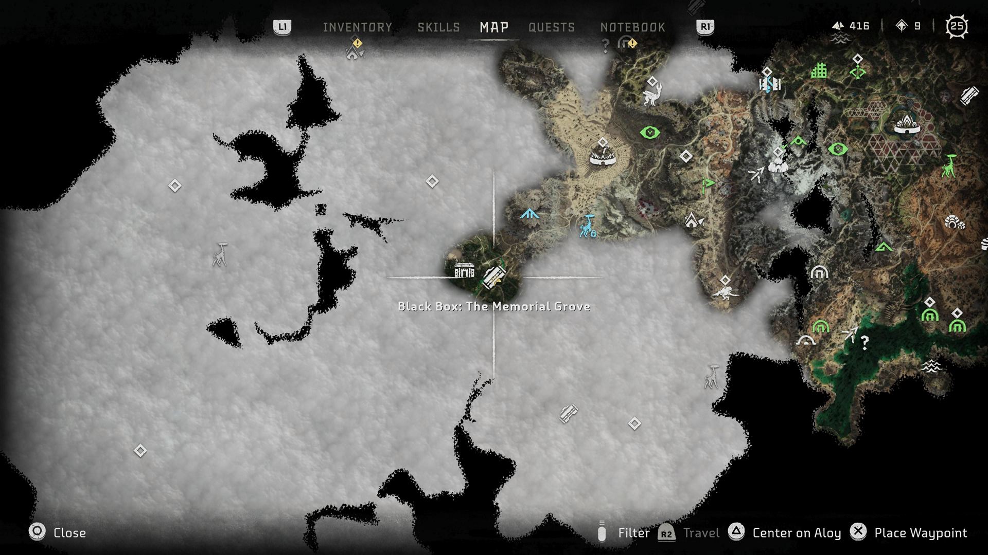 - 지도 - 지도를 열면 마을/유적/퀘스트/모닥불/가마솥/기계/수집물/톨넥 등의 다양한 위치 정보를 확인할 수 있다. 맵상에 마커를 설정하면 노란색으로 목적지까지 길을 표시해 준다. 가본 적이 없는 곳은 흰 안개로 표시되며 길을 직접 밝히거나 톨넥을 강제 전환하면 흰 안개가 제거되면서 맵을 밝힐 수 있게 된다.