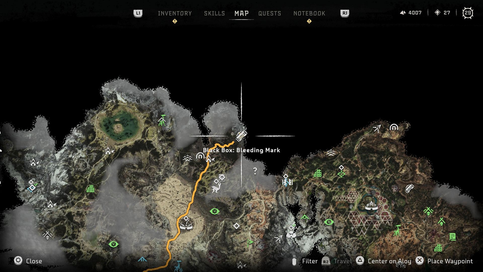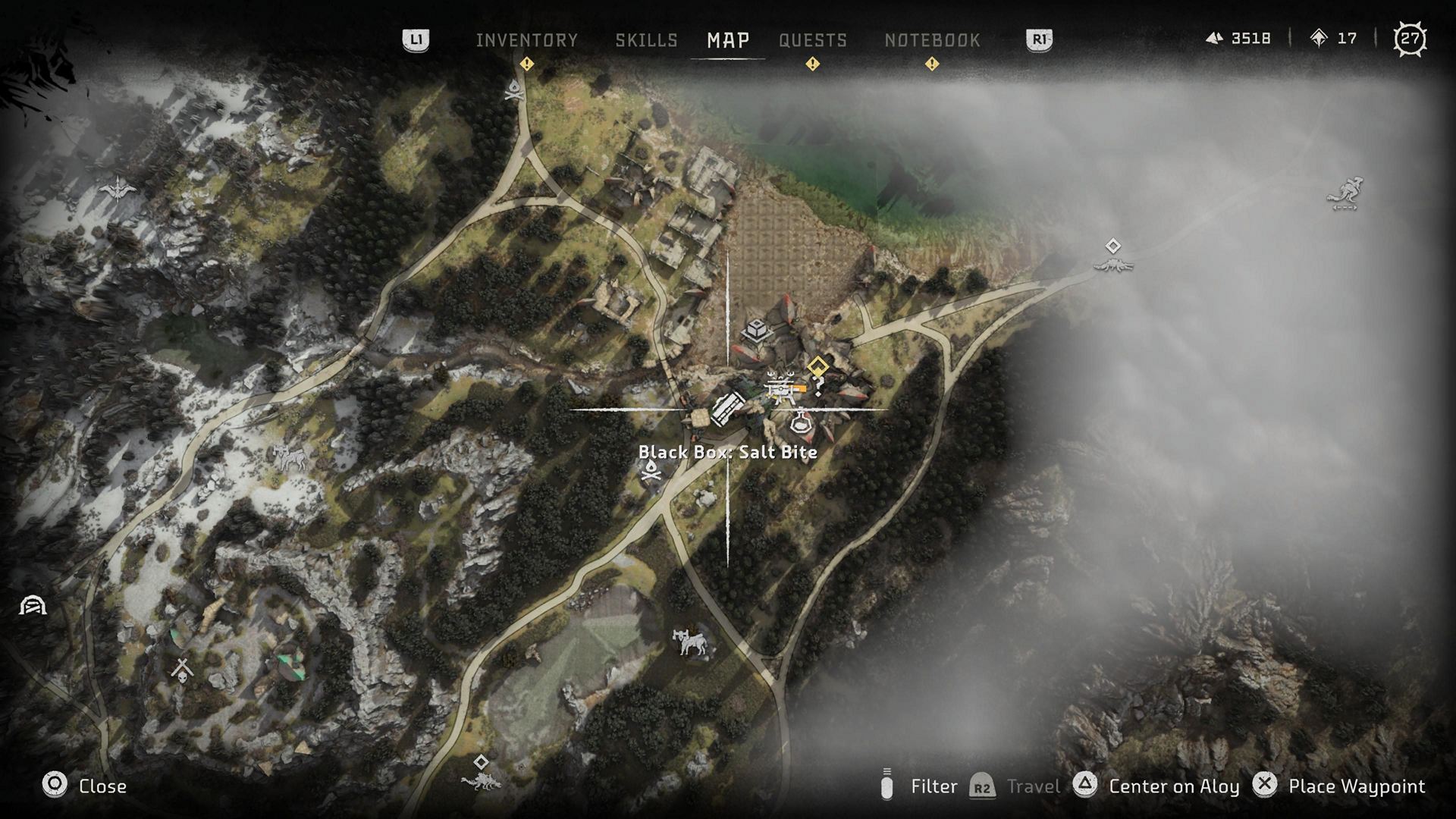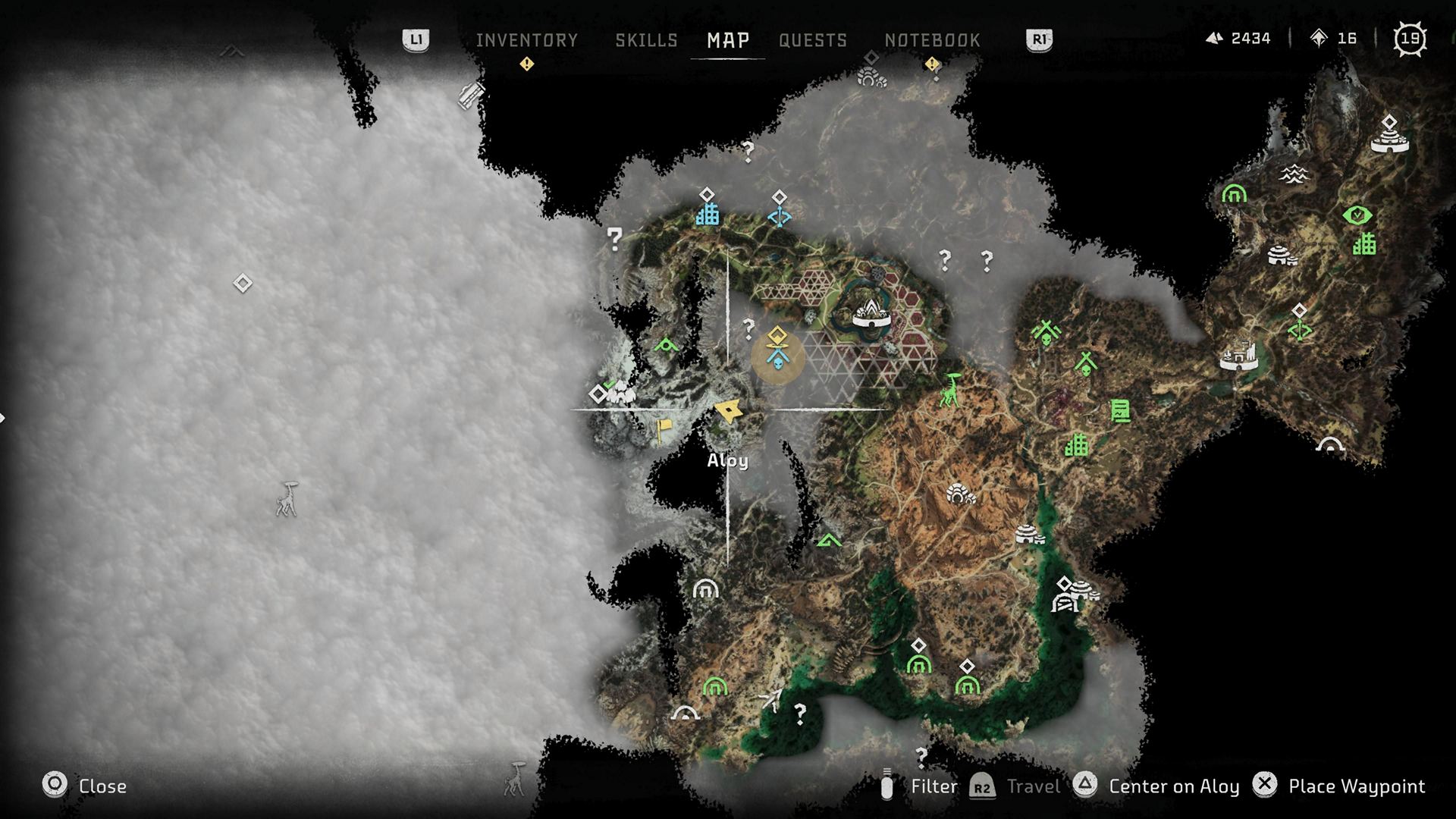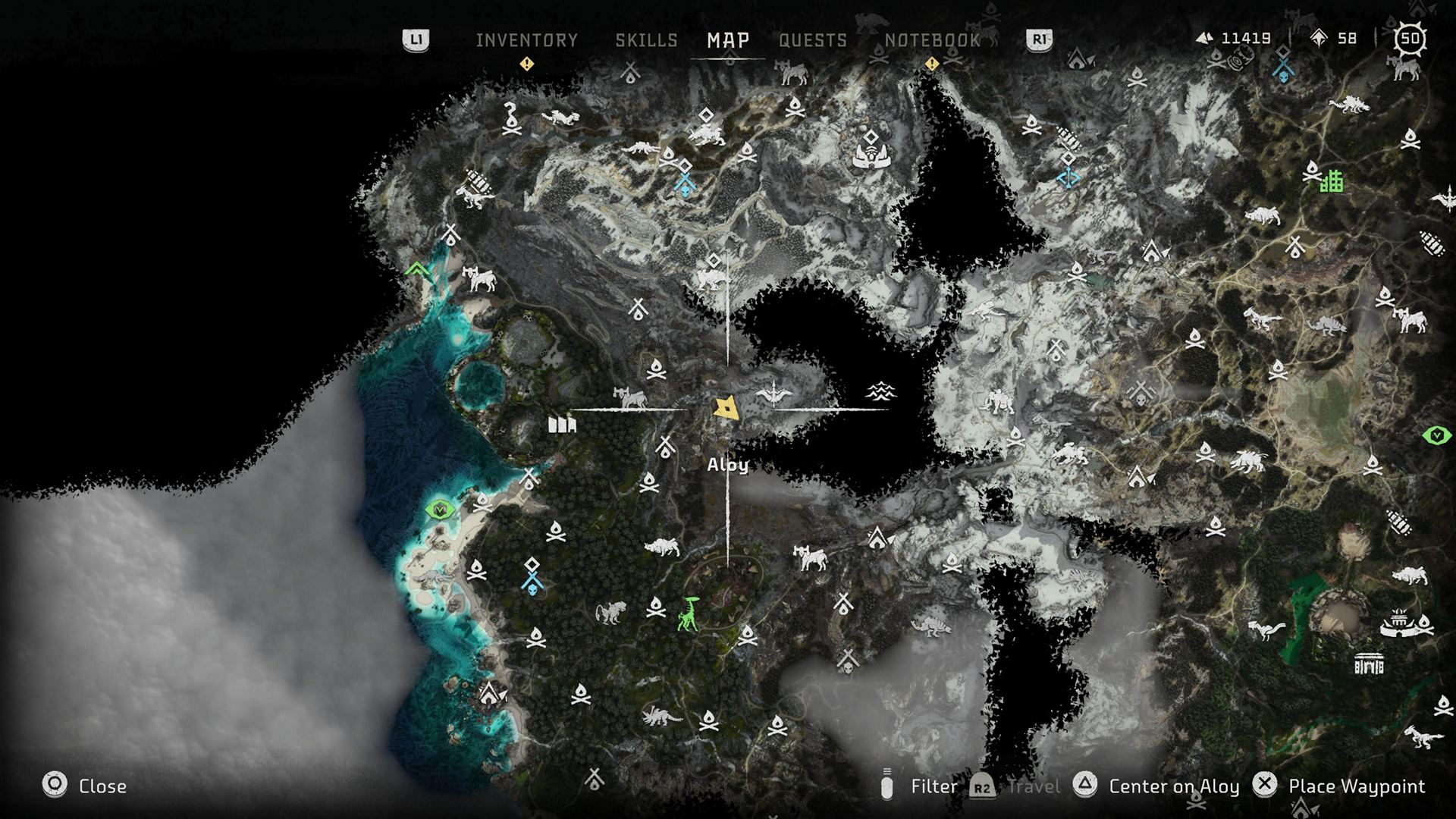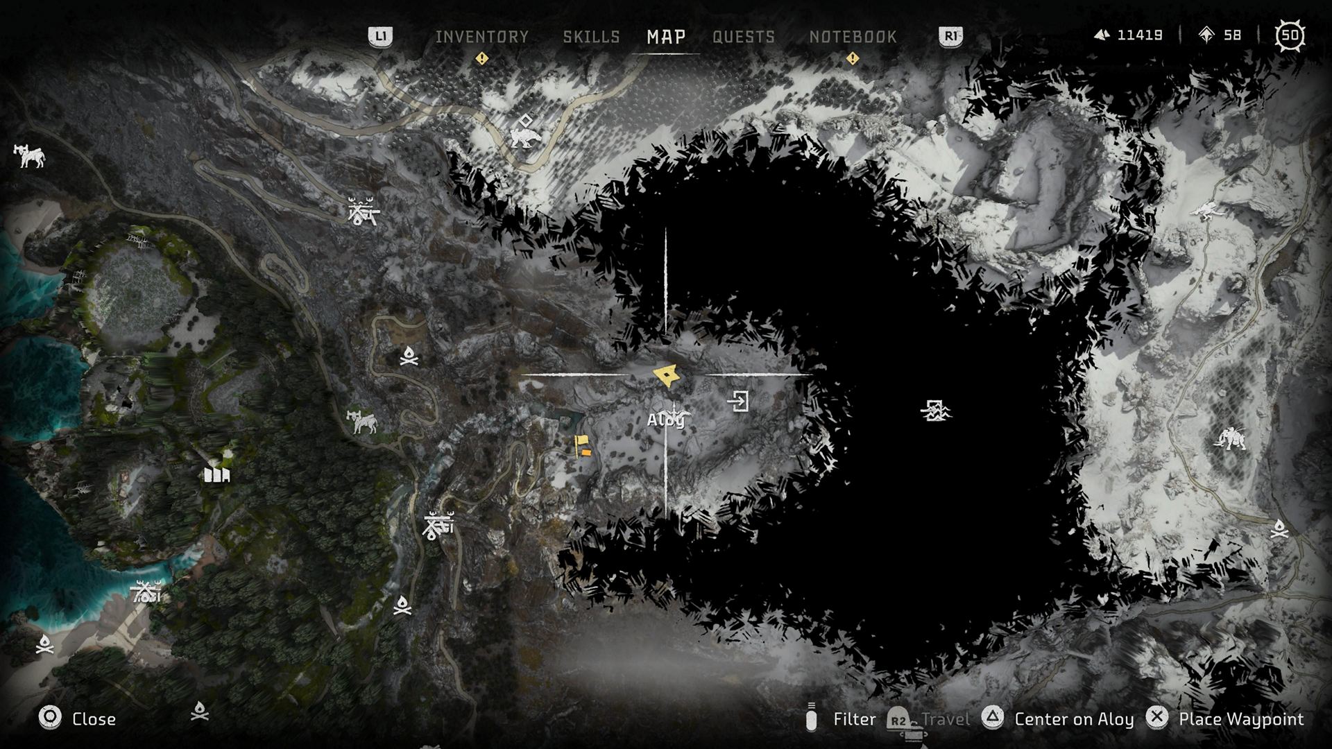 - 지도 - 지도를 열면 마을/유적/퀘스트/모닥불/가마솥/기계/수집물/톨넥 등의 다양한 위치 정보를 확인할 수 있다. 맵상에 마커를 설정하면 노란색으로 목적지까지 길을 표시해 준다. 가본 적이 없는 곳은 흰 안개로 표시되며 길을 직접 밝히거나 톨넥을 강제 전환하면 흰 안개가 제거되면서 맵을 밝힐 수 있게 된다.