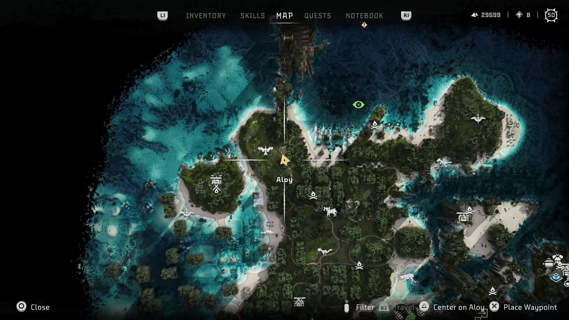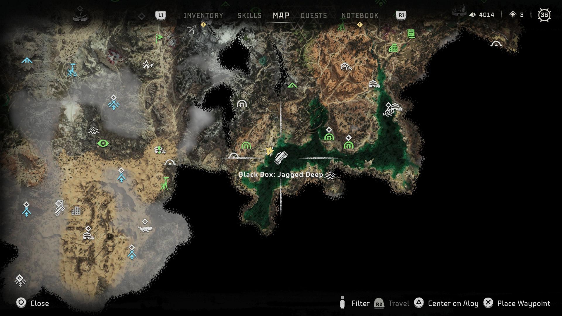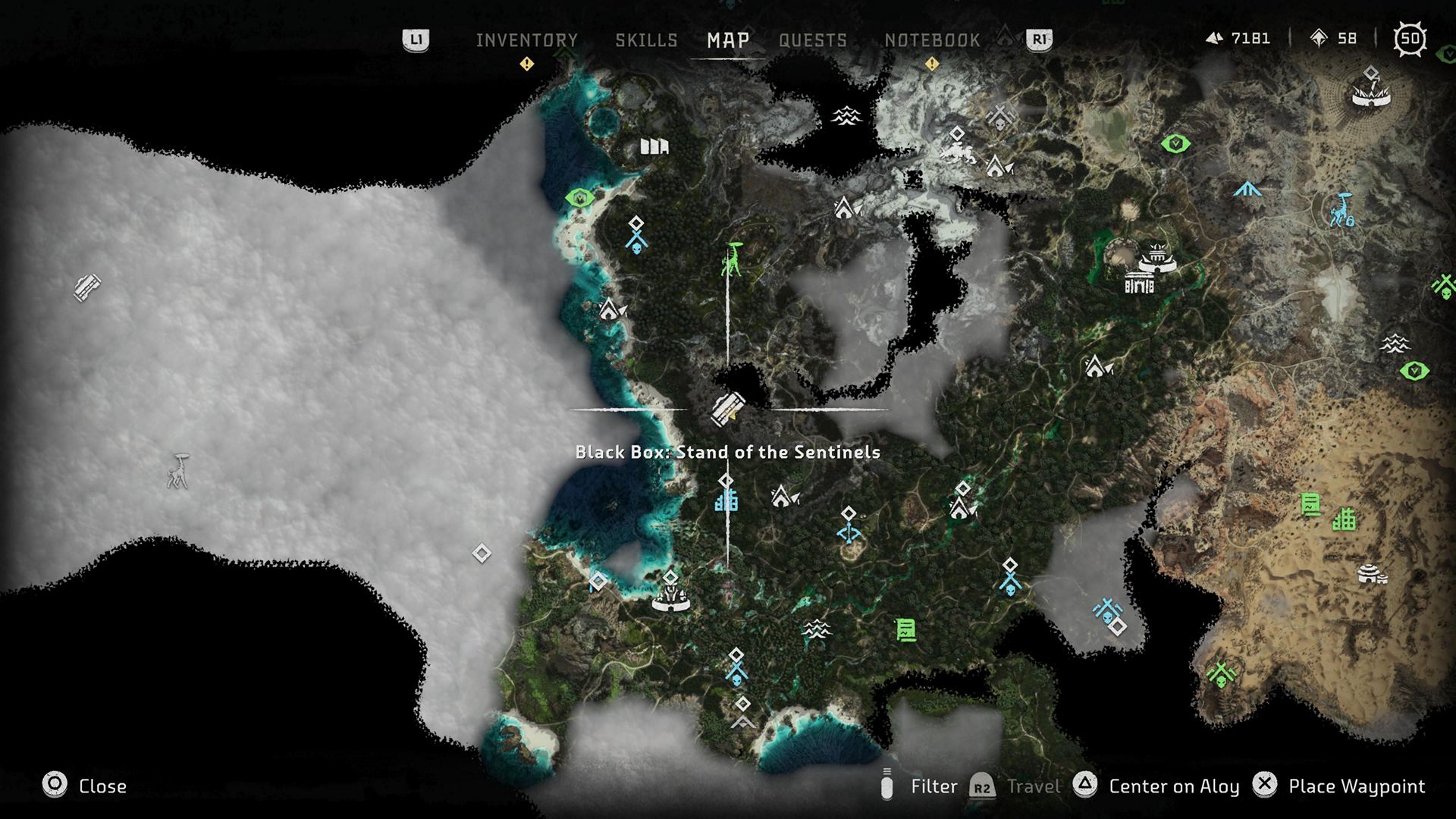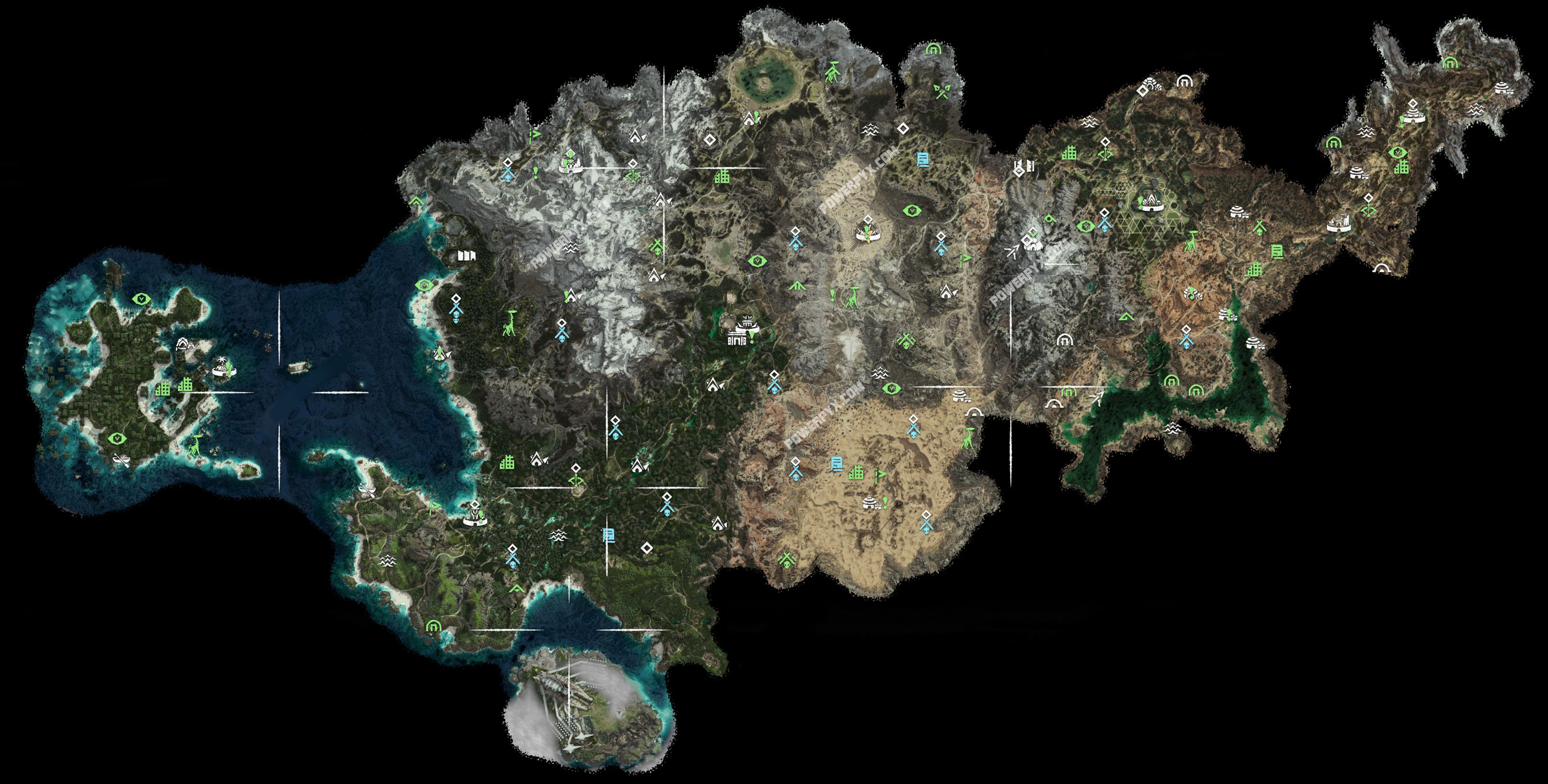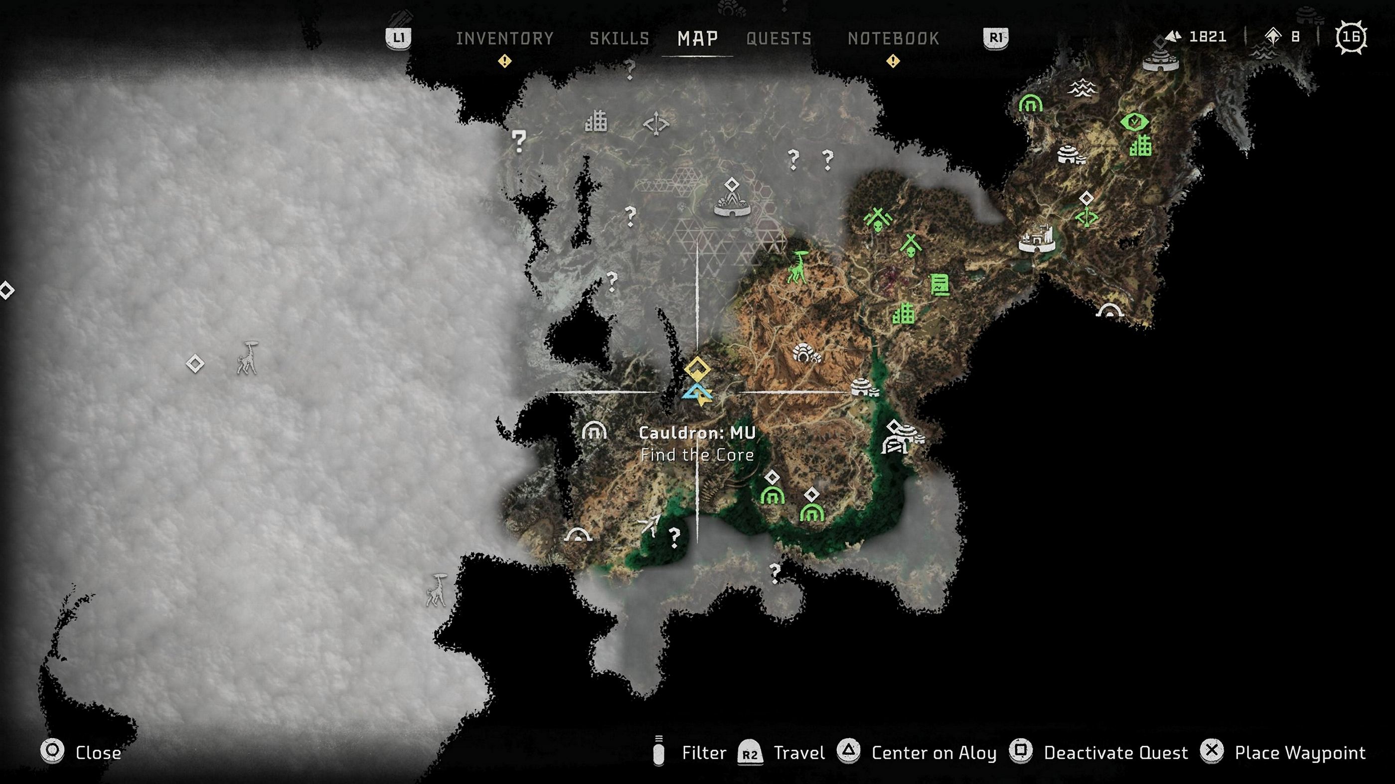 - 지도 - 지도를 열면 마을/유적/퀘스트/모닥불/가마솥/기계/수집물/톨넥 등의 다양한 위치 정보를 확인할 수 있다. 맵상에 마커를 설정하면 노란색으로 목적지까지 길을 표시해 준다. 가본 적이 없는 곳은 흰 안개로 표시되며 길을 직접 밝히거나 톨넥을 강제 전환하면 흰 안개가 제거되면서 맵을 밝힐 수 있게 된다.