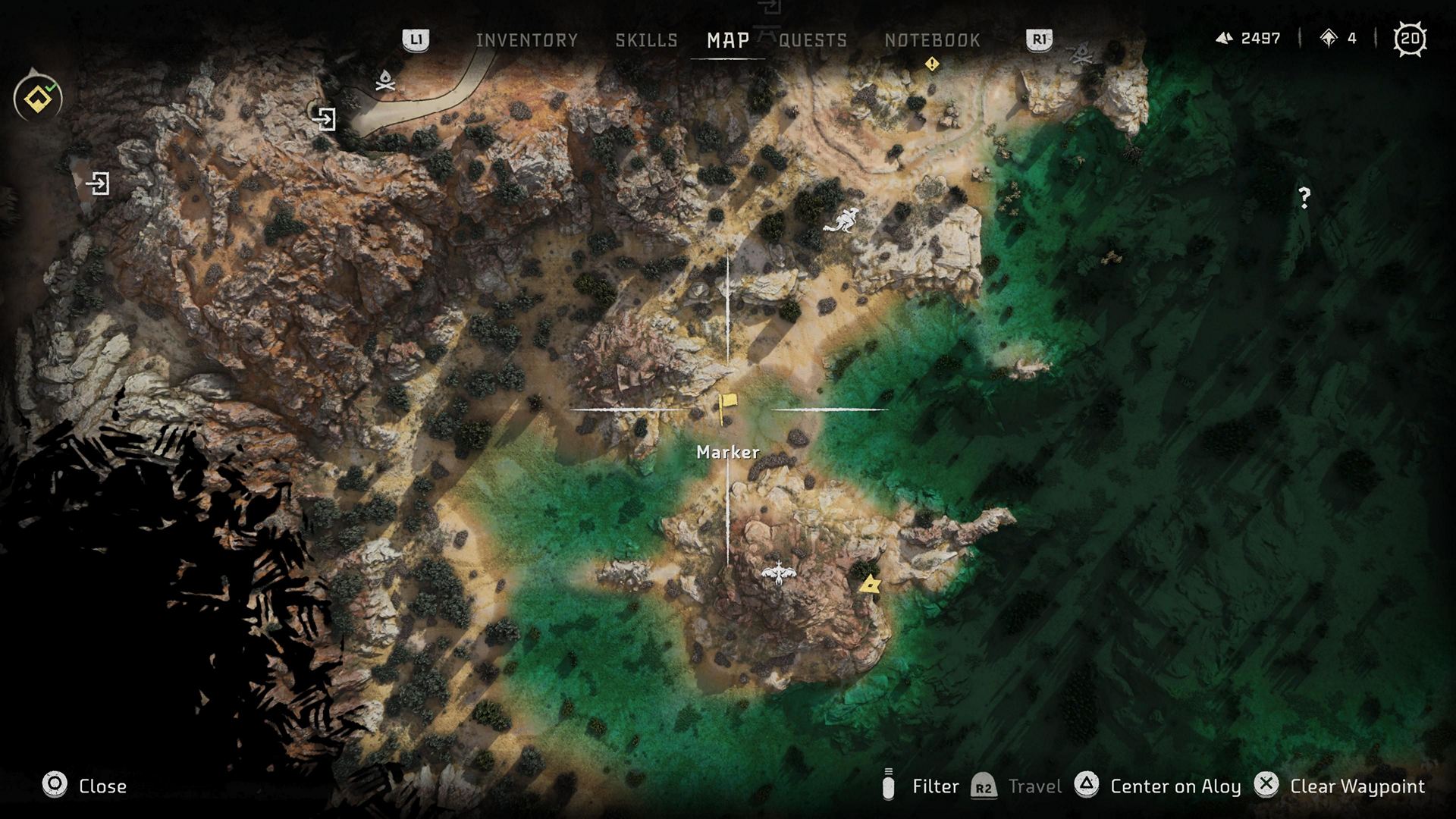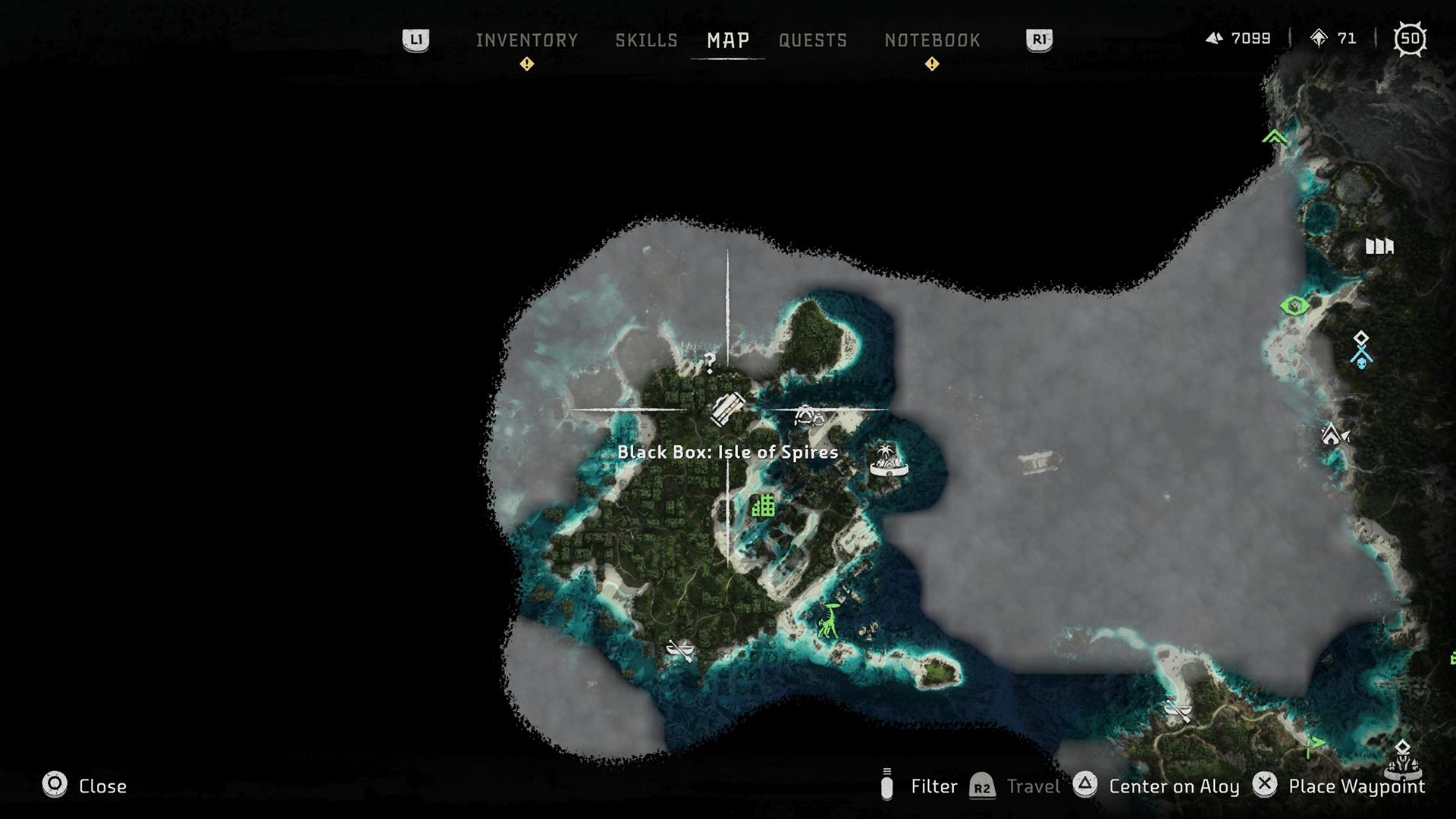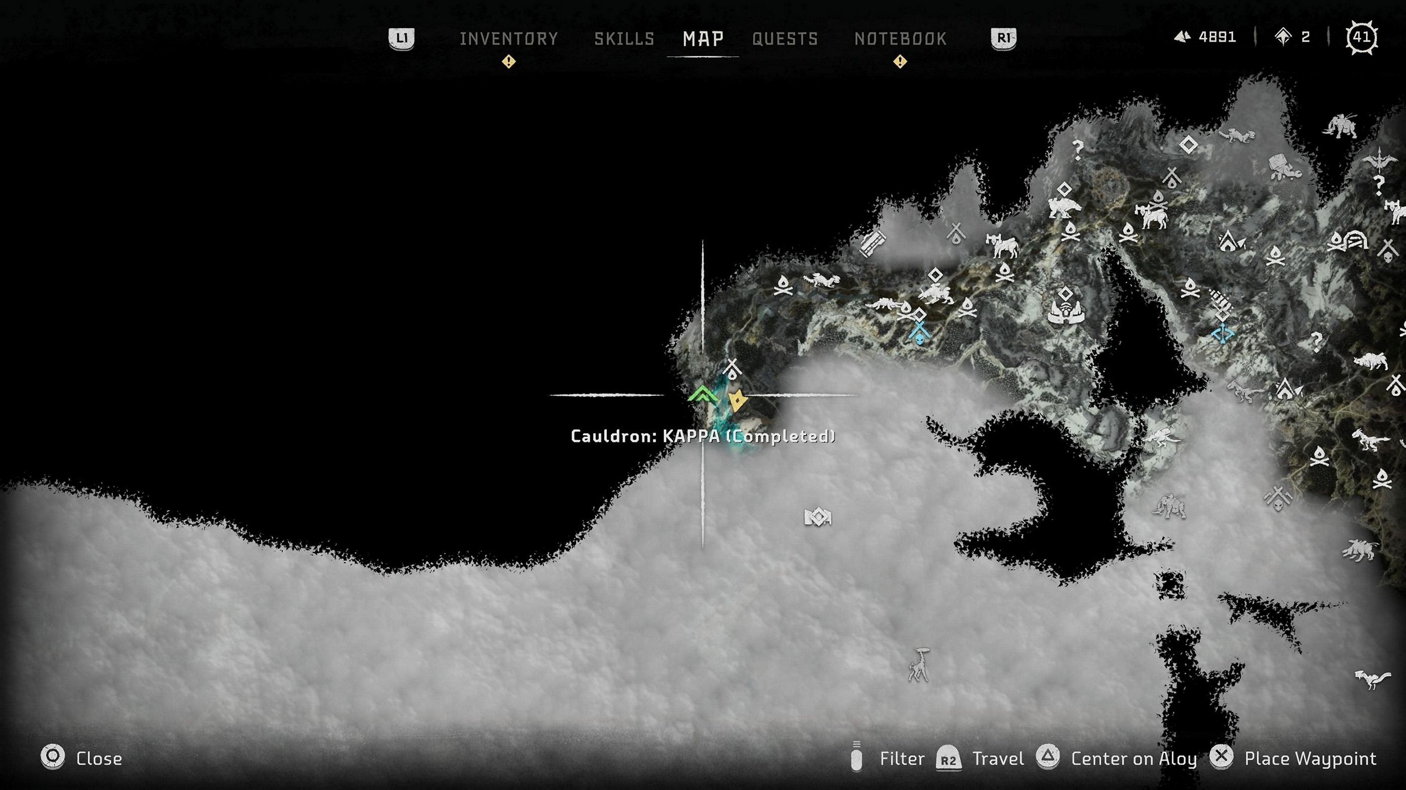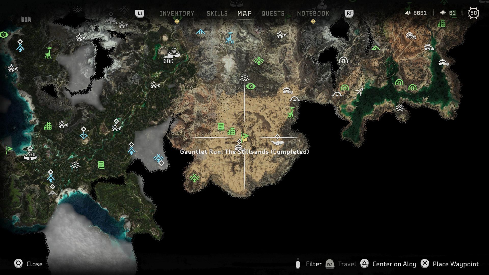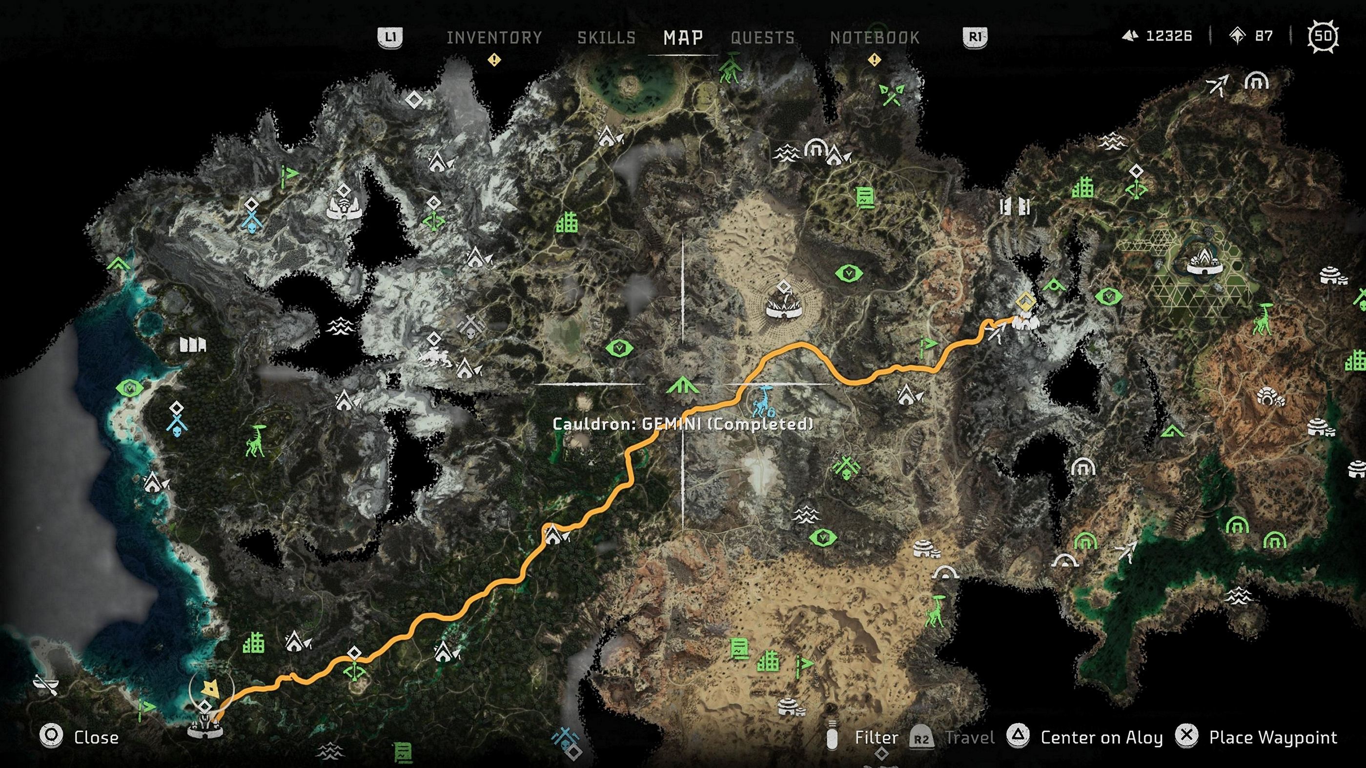 - 지도 - 지도를 열면 마을/유적/퀘스트/모닥불/가마솥/기계/수집물/톨넥 등의 다양한 위치 정보를 확인할 수 있다. 맵상에 마커를 설정하면 노란색으로 목적지까지 길을 표시해 준다. 가본 적이 없는 곳은 흰 안개로 표시되며 길을 직접 밝히거나 톨넥을 강제 전환하면 흰 안개가 제거되면서 맵을 밝힐 수 있게 된다.