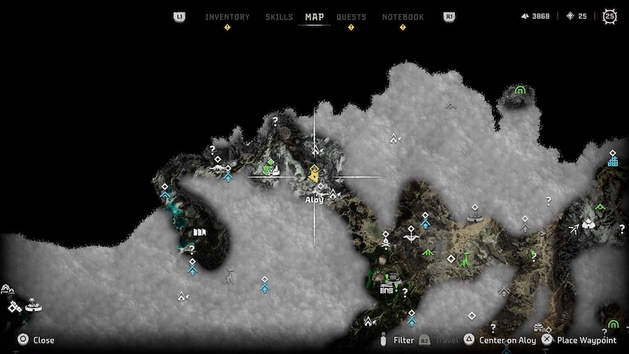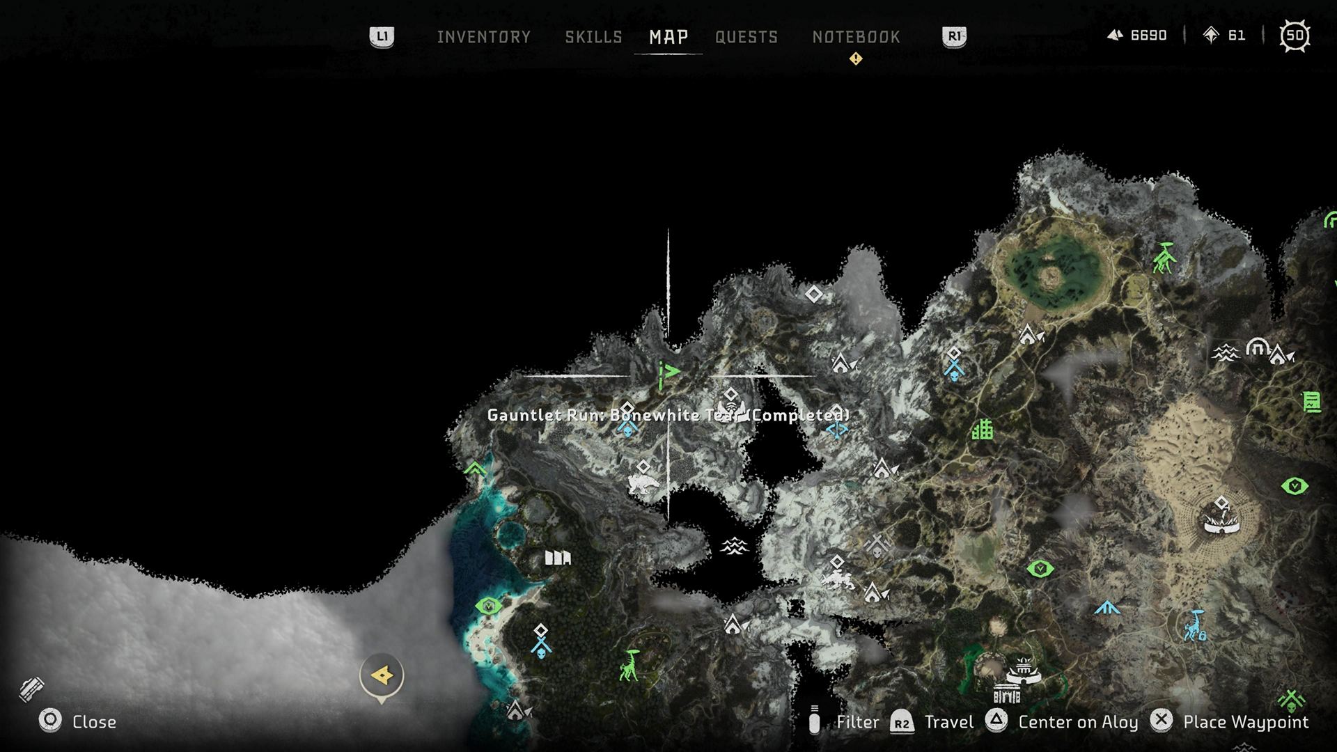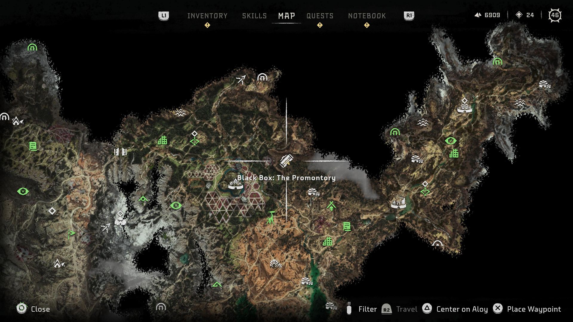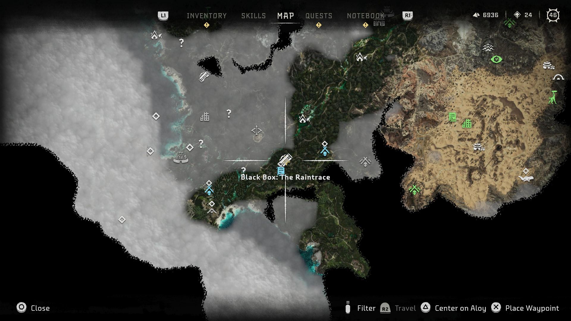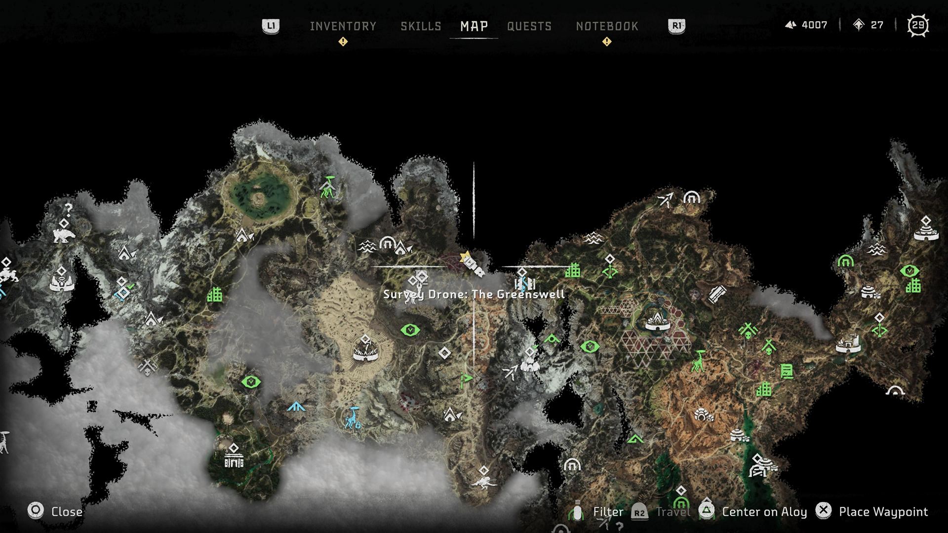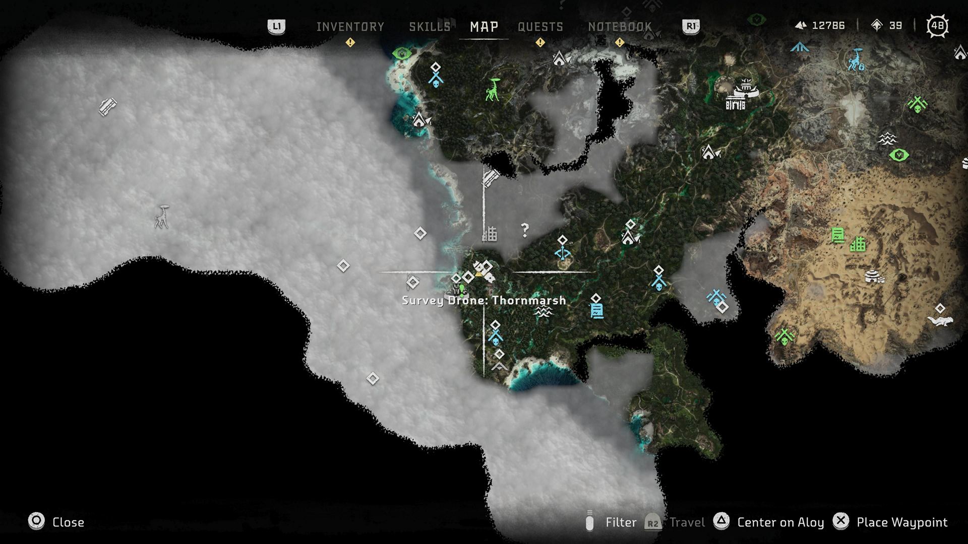 - 지도 - 지도를 열면 마을/유적/퀘스트/모닥불/가마솥/기계/수집물/톨넥 등의 다양한 위치 정보를 확인할 수 있다. 맵상에 마커를 설정하면 노란색으로 목적지까지 길을 표시해 준다. 가본 적이 없는 곳은 흰 안개로 표시되며 길을 직접 밝히거나 톨넥을 강제 전환하면 흰 안개가 제거되면서 맵을 밝힐 수 있게 된다.