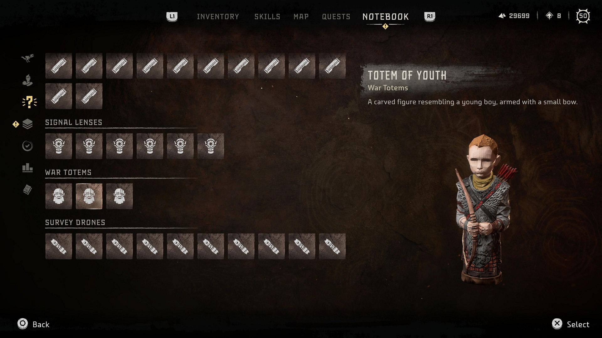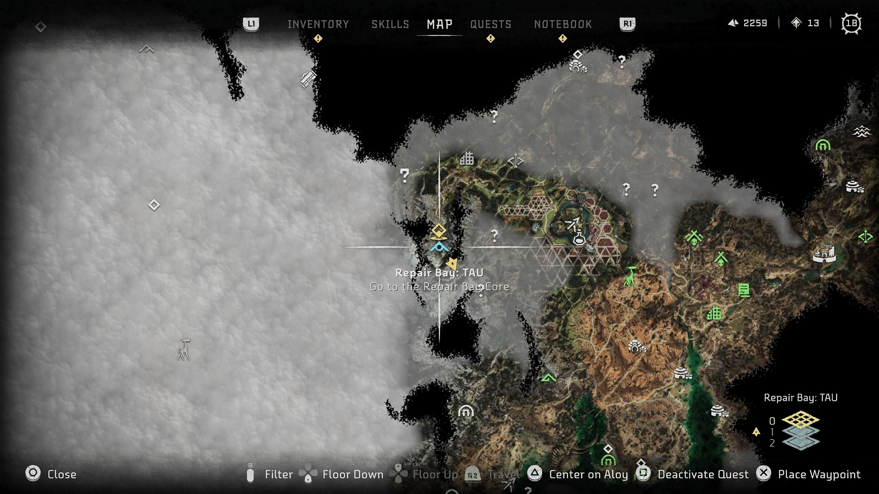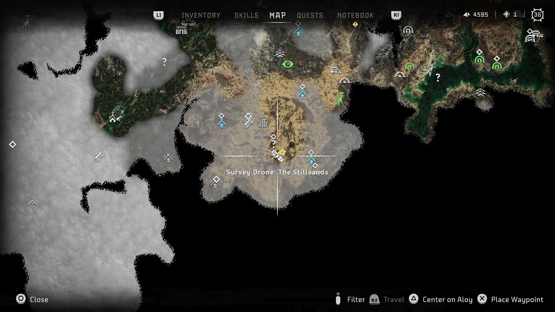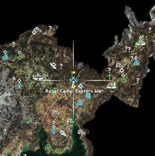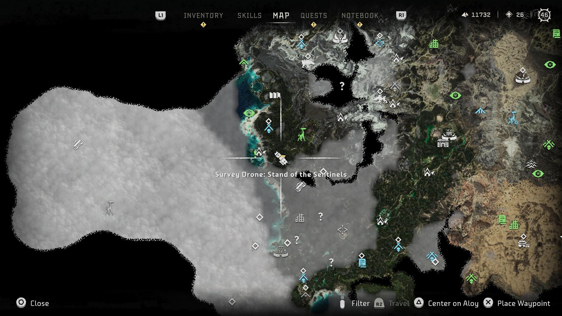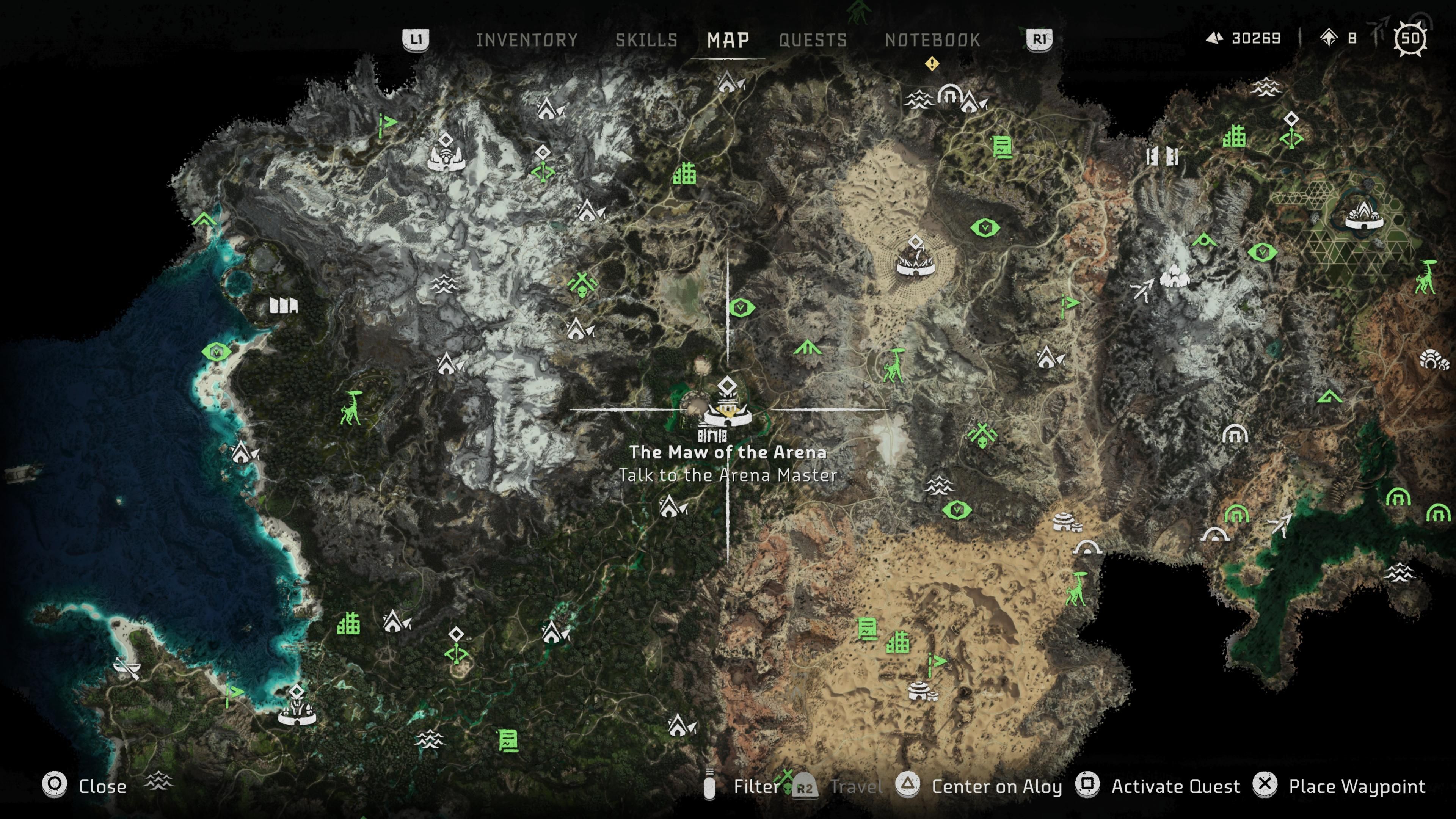 - 지도 - 지도를 열면 마을/유적/퀘스트/모닥불/가마솥/기계/수집물/톨넥 등의 다양한 위치 정보를 확인할 수 있다. 맵상에 마커를 설정하면 노란색으로 목적지까지 길을 표시해 준다. 가본 적이 없는 곳은 흰 안개로 표시되며 길을 직접 밝히거나 톨넥을 강제 전환하면 흰 안개가 제거되면서 맵을 밝힐 수 있게 된다.