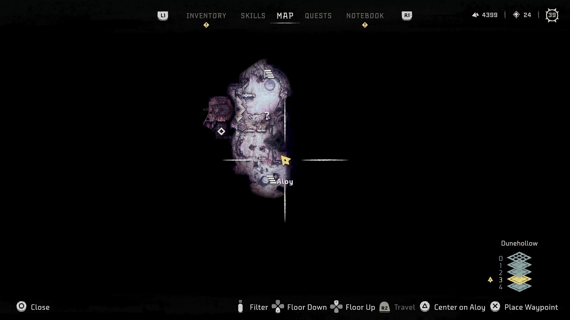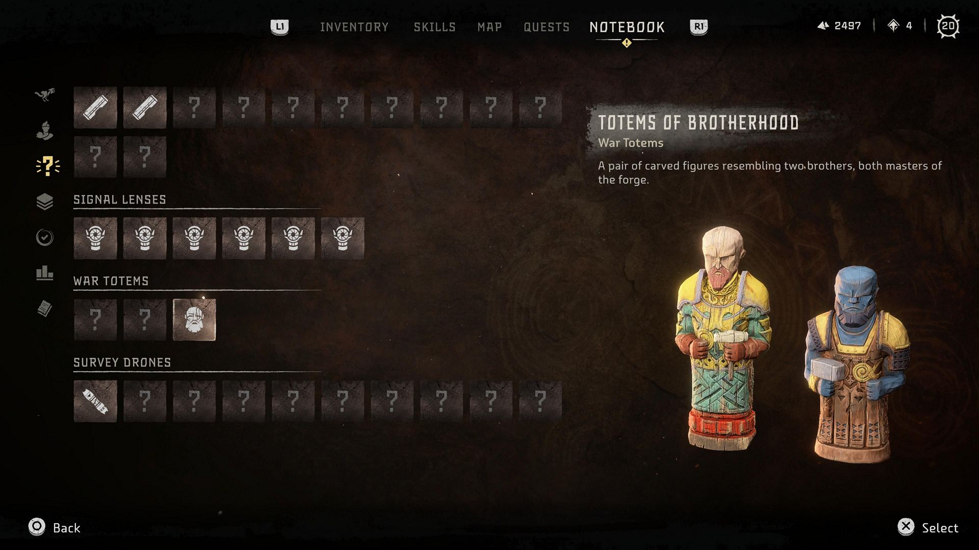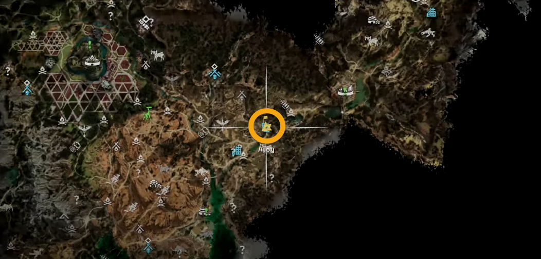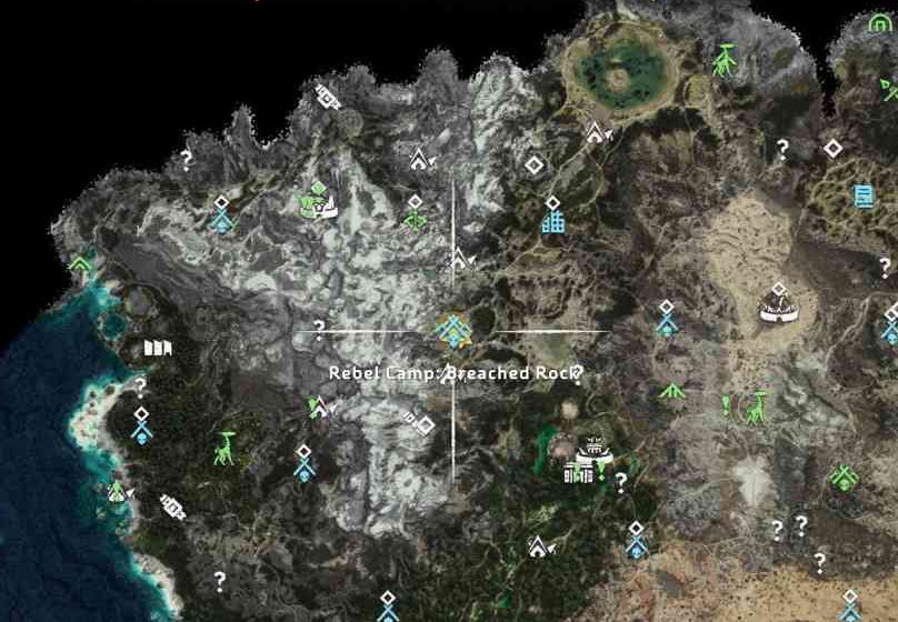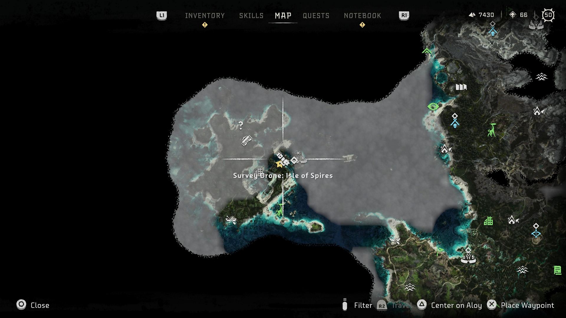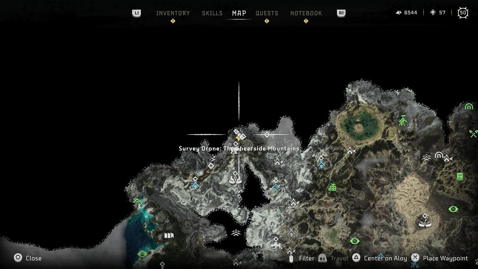 - 지도 - 지도를 열면 마을/유적/퀘스트/모닥불/가마솥/기계/수집물/톨넥 등의 다양한 위치 정보를 확인할 수 있다. 맵상에 마커를 설정하면 노란색으로 목적지까지 길을 표시해 준다. 가본 적이 없는 곳은 흰 안개로 표시되며 길을 직접 밝히거나 톨넥을 강제 전환하면 흰 안개가 제거되면서 맵을 밝힐 수 있게 된다.