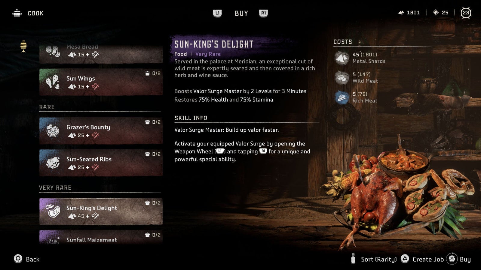 - 요리로 능력치 버프 시키기 - 마을의 요리사를 방문하면 여러 버프/회복 효과를 제공하는 요리를 샤드와 제작 재료로 살 수 있다. 일반에서 전설까지 다양한 등급의 요리 제작이 가능.