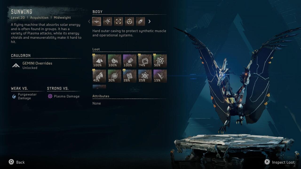 고도로 발전된 이 모바일 전투 드론은 특정 목적을 위해 만들어졌으며 자연의 동물을 기반으로 하지 않는다. 메인 스토리를 진행하다보면 볼 수 있고 갑옷을 닮은 골드 플레이트는 뜯겨 나가면 치명적인 무기로 변해 중력에 의해 다시 붙을 수 있다. | 변종 없음 |