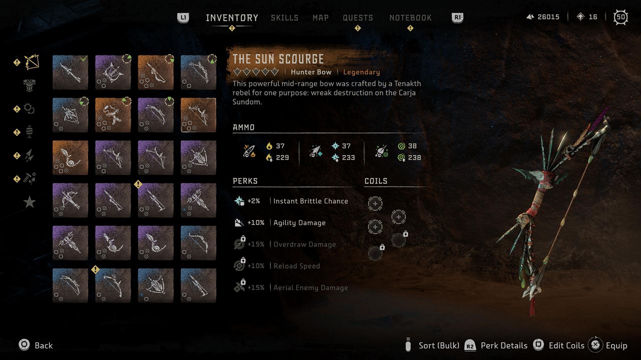 - 태양의 재앙 (전설 사냥꾼 활) - 총 6개의 반란군 전추기지를 완료하면 얻을 수 있다. 지도에 있는 모든 5개의 반란군 전초기지를 완료하면 6번째 비밀 전초기지 퀘스트가 해금되며 퀘스트를 추적하면 에렌드와 대화할 수 있는 웨이포인트가 생긴다. 에렌드에게 말을 걸면 마지막 반란군 진영으로 가는 퀘스트를 주며 마지막 보스 아세라를 죽이면 전설 활을 드랍한다.