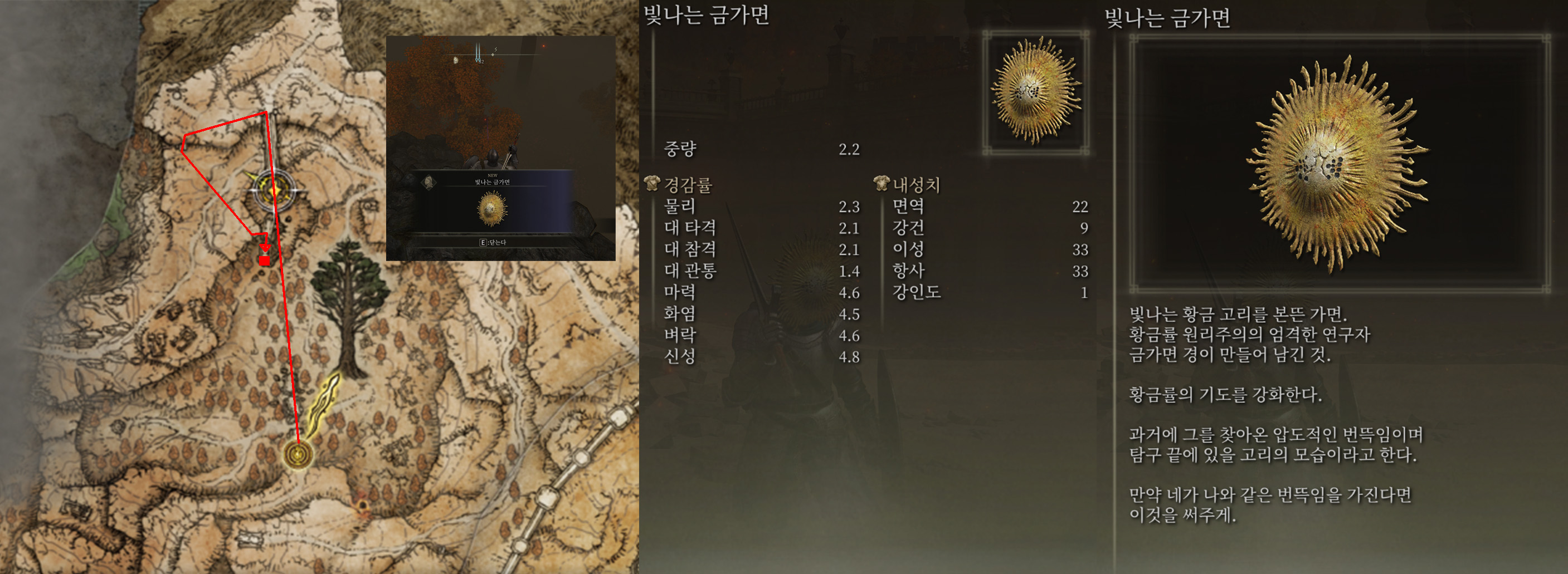 이후 알터 고원에서 포탈을 타고 해당 위치로 이동하면 「투구: 빛나는 금가면(황금률의 기도를 강화한다)」 입수 가능.