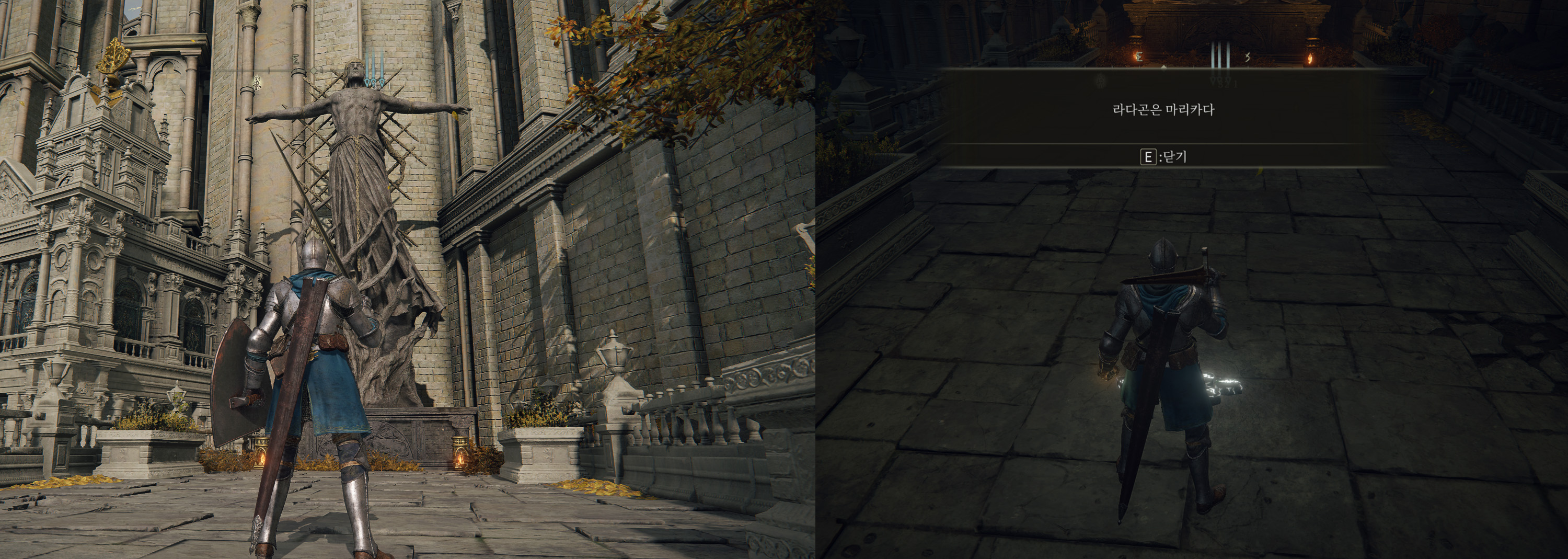 - 라다곤 석상앞에서 희귀성 원리 사용 - 「축복:황금 나무의 대성당」에서 좌측으로 내려가 승강기를 타고 내려와 라다곤의 석상 앞 바닥의 메시지를 읽고 기도 마법 「희귀성 원리」를 사용한다. 그러면 「라다곤은 마리카다」라는 새로운 메시지가 출현한다.