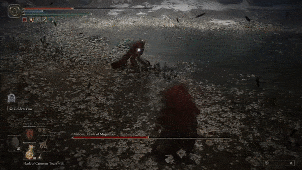 - 말레니아 1페이즈 - 엘든 링 최강 보스 중 한명. 말레니아는 공격속도가 매우 빠르고 연속 베기, 찌르기 등을 사용한다. 피흡혈 공격을 하므로 최대한 안맞는게 중요, 특히 콤보에 맞으면 상당한 체력을 회복한다. 점프 후 공중에 잠시 있다가 돌진하는 연속 회오리 공격하니 최대한 피하자. 1번 죽이면 날개가 달린 부패의 여신으로 부활한다.