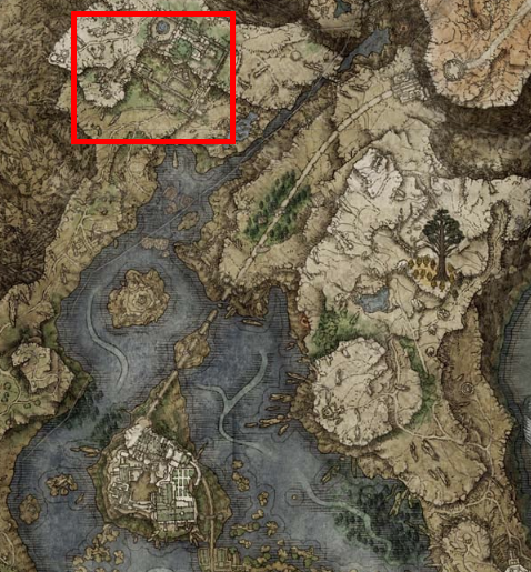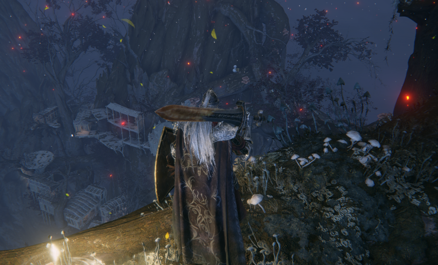 - 흉조의 아이 모그 보스전과 숨겨진 길 - 앞에서 나오는 보스 모그를 처치하면 「황금 나무의 은총+1」, 상자에서 「기도: 혈염의 발톱자국」 입수. 정면의 석상을 공격하면 비밀 길이 열린다. 묘지 안에는 많은 시체들이 있고, 빛나는 유저 메시지가 새겨진 나무 판자, 돌을 발판 삼아 계속 내려가면 된다. 내려가는 도중 「지문석의 방패」도 얻을 수 있다.