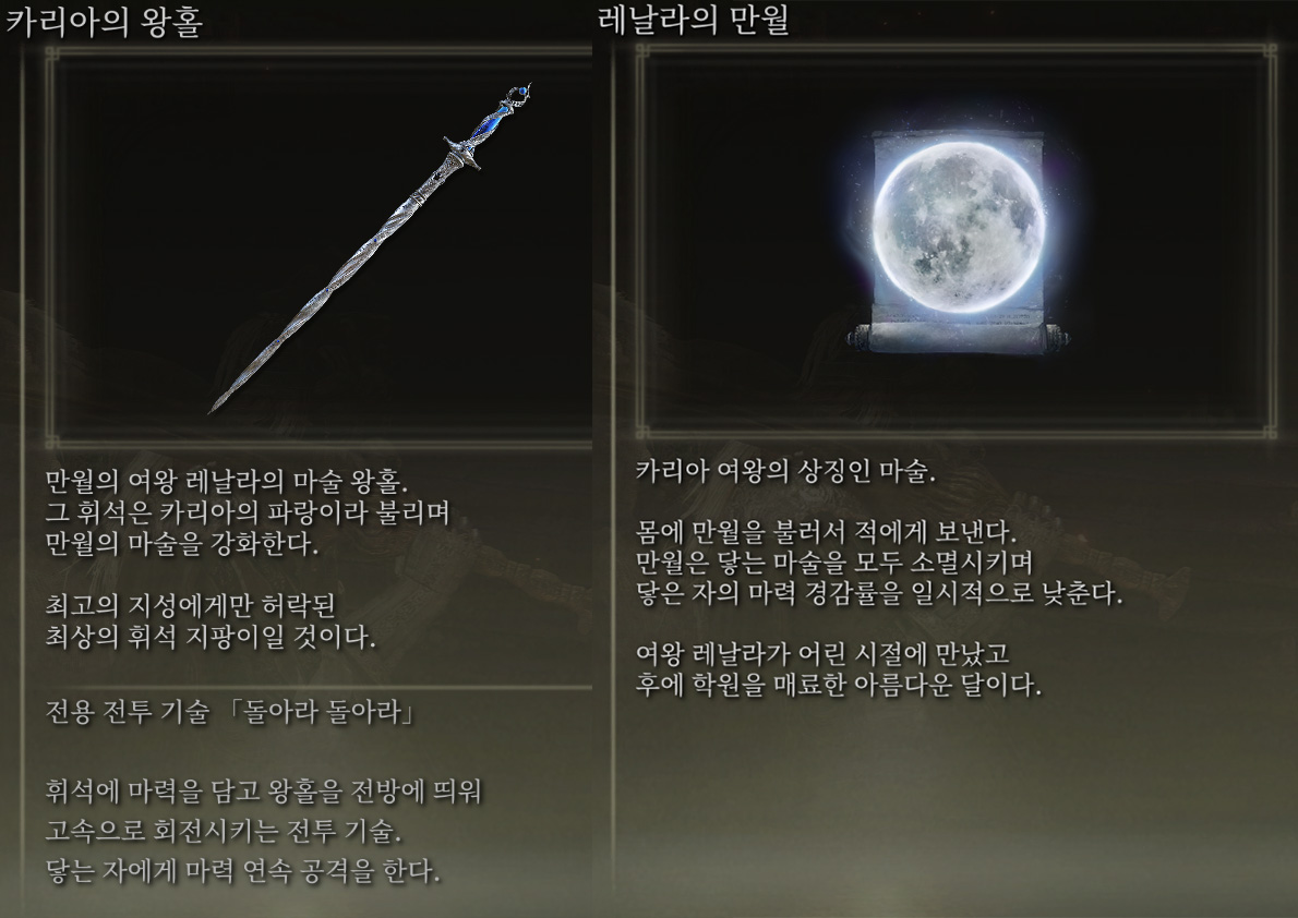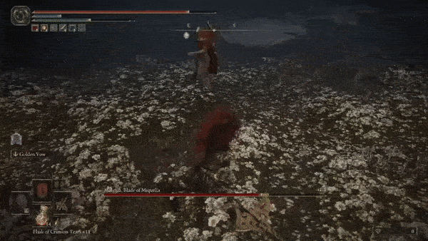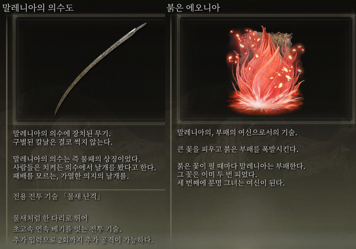 누가 뭘 위해 엘든 링을 부셨지? 데미갓들은 뭘 위해 싸웠지? 별 부수는 영웅, 장군 「라단」, 미켈라의 칼날, 결여된 몸 「말레니아」. 가장 강했던 둘이 마지막으로 싸웠고 결국 아무도 이기지 못했지. 그러니 지금도 세계는 망가진 채로 엘데의 왕을 기다리는 거야. 어쩌면, 네가 그 왕이려나?