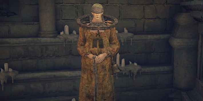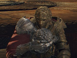 - 금가면과 콜린과 대화 - 다시 금가면에게 가서 말을 걸어 「라다곤은 마리카다」라고 전하면 「포즈:황금률의 전모」를 얻을 수 있다. 그리고 콜린에게 말을 걸어 얘기를 듣고, 새로운 기도 「불역의 방패(왼손 방패의 속성과 상태 이상 경감률을 높힌다)」도 구입할 수 있다.