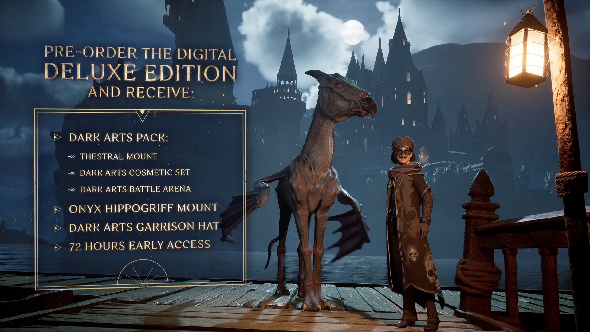 • 호그와트 레거시 본편 • 특별 퀘스트 • 어둠의 마법 팩(세스트랄 탈것, 어둠의 마법 배틀 아레나, 어둠의 마법 코스메틱) • 어둠의 마법 수비대 모자 • 얼리 엑세스 (72시간) |