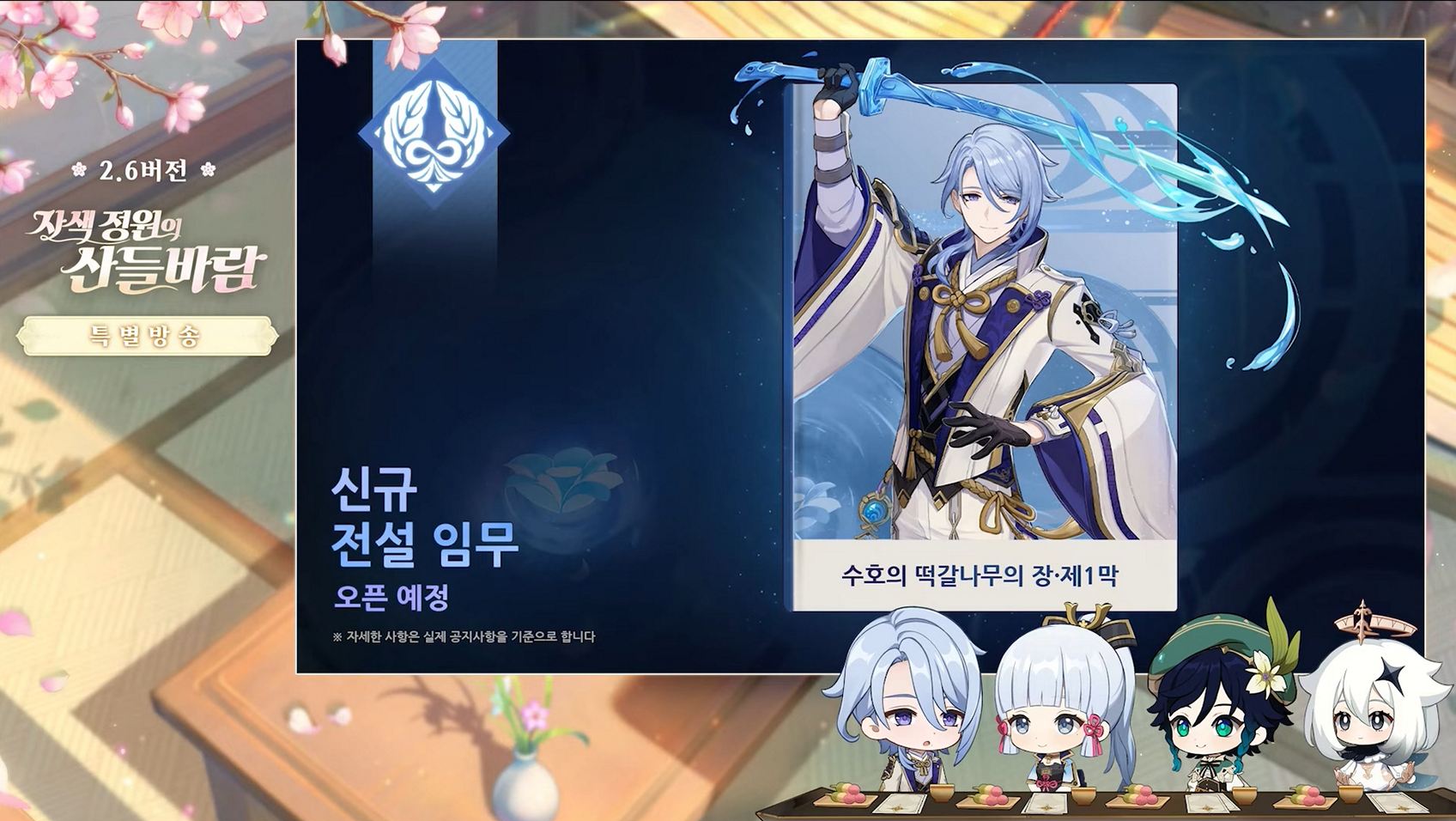 - 신규 전설 임무 - 아야토의 전설 임무 「수호의 떡갈나무 장 제1막」이 오픈될 예정. 쇄국령이 폐지되고 이나즈마가 새로운 시대를 맞이하면서 텐여봉행과 간저봉행 사이에 모처럼의 경사가 다가오고 있다. 겉으로는 경사스럽지만 그 속에는 암류가 꿈틀 되고 있으며, 야시로 봉행인 아야토가 어떻게 대응할지 함께 지켜보자.