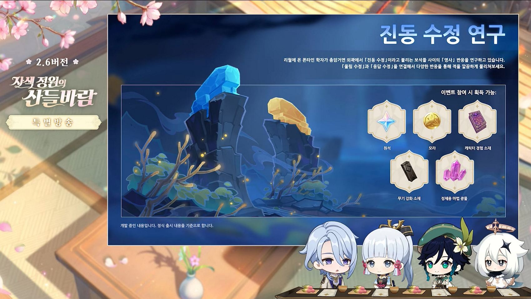 - 신규 도전 이벤트, 진동 수정 연구 - 리월에 온 폰타인 학자가 층암거연 외각에서 「진동 수정」이라고 불리는 보석들 사이의 「영사」 반응을 연구하고 있다. 「울림 수정」과 「응답 수정」을 연결해서 다양한 반응을 통해 적을 깔끔하게 물리치자.