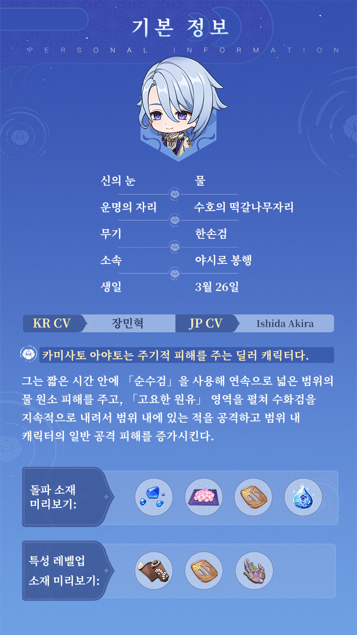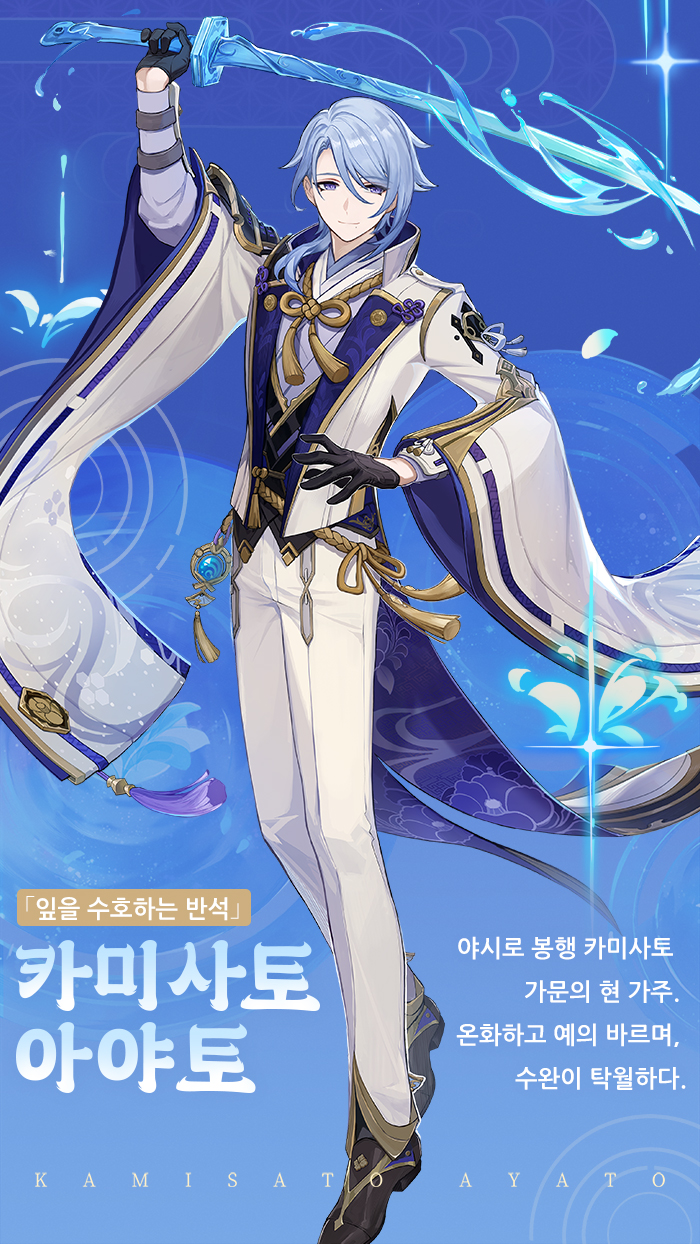 - ★5 잎을 수호하는 반석, 카미사토 아야토 - 야시로 봉행 카미사토 가문의 현 가주. 온화하고 예의 바르며, 수완이 탁월하다. 카미사토 아야토에 대해서는 여동생 '아야카'와 '토마', 혹은 '아라타키 이토'에게 들어 본 적이 있을지도 모른다. 아야토는 상당히 느긋하고 방자한 면이 있으며 밀크티를 좋아한다. '이토'와 사이가 좋고, 그리고 항상 실패한 요리를 '토마'에게 먹이고 있다고 한다.