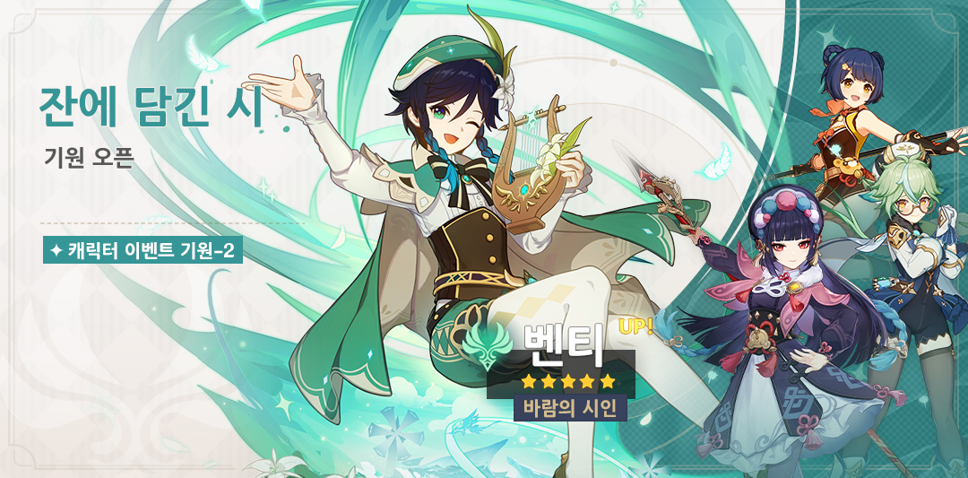 | 제1회 잔에 담긴 시 | ★5 「벤티」 확률 UP ★4 캐릭터 「무해한 달콤함·설탕(바람)」, 「만민백미·향릉(불)」, 「무대를 빛내는 가인·운근(바위)」 확률 UP |