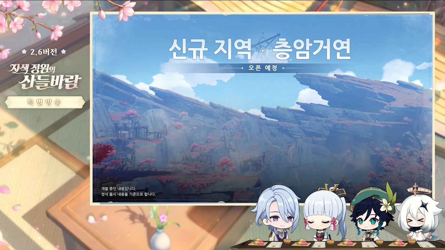 여행자 여러분 안녕하세요! 오늘은 3월 30일(수)에 출시될 원신 Ver.2.6 「자색 정원의 산들바람」 의 최신 정보를 전달합니다. 이번 버전에서는 새로운 영역 층암거연이 추가됩니다. 리월의 최서단을 향해, 바닥을 알 수 없는 영역으로 가서 데인슬레이브와 함께 여행자의 새로운 이야기를 들어보세요.