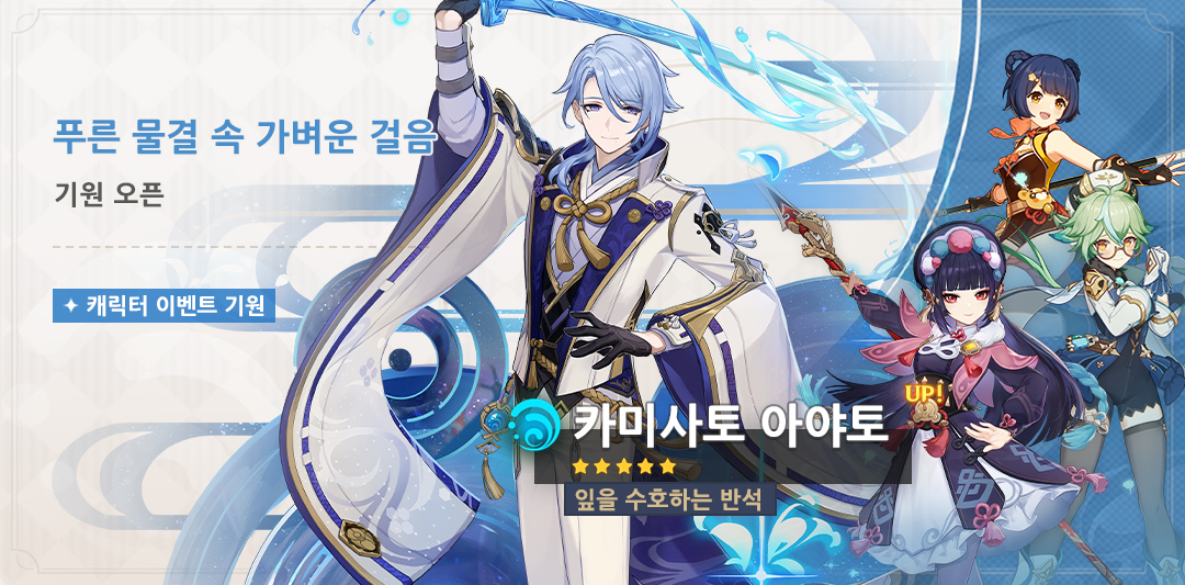 | 제1회 푸른 물결 속 가벼운 걸음 | ★5 「카미사토 아야토」 확률 UP ★4 캐릭터「무해한 달콤함·설탕(바람)」, 「만민백미·향릉(불)」, 「무대를 빛내는 가인·운근(바위)」 확률 UP |