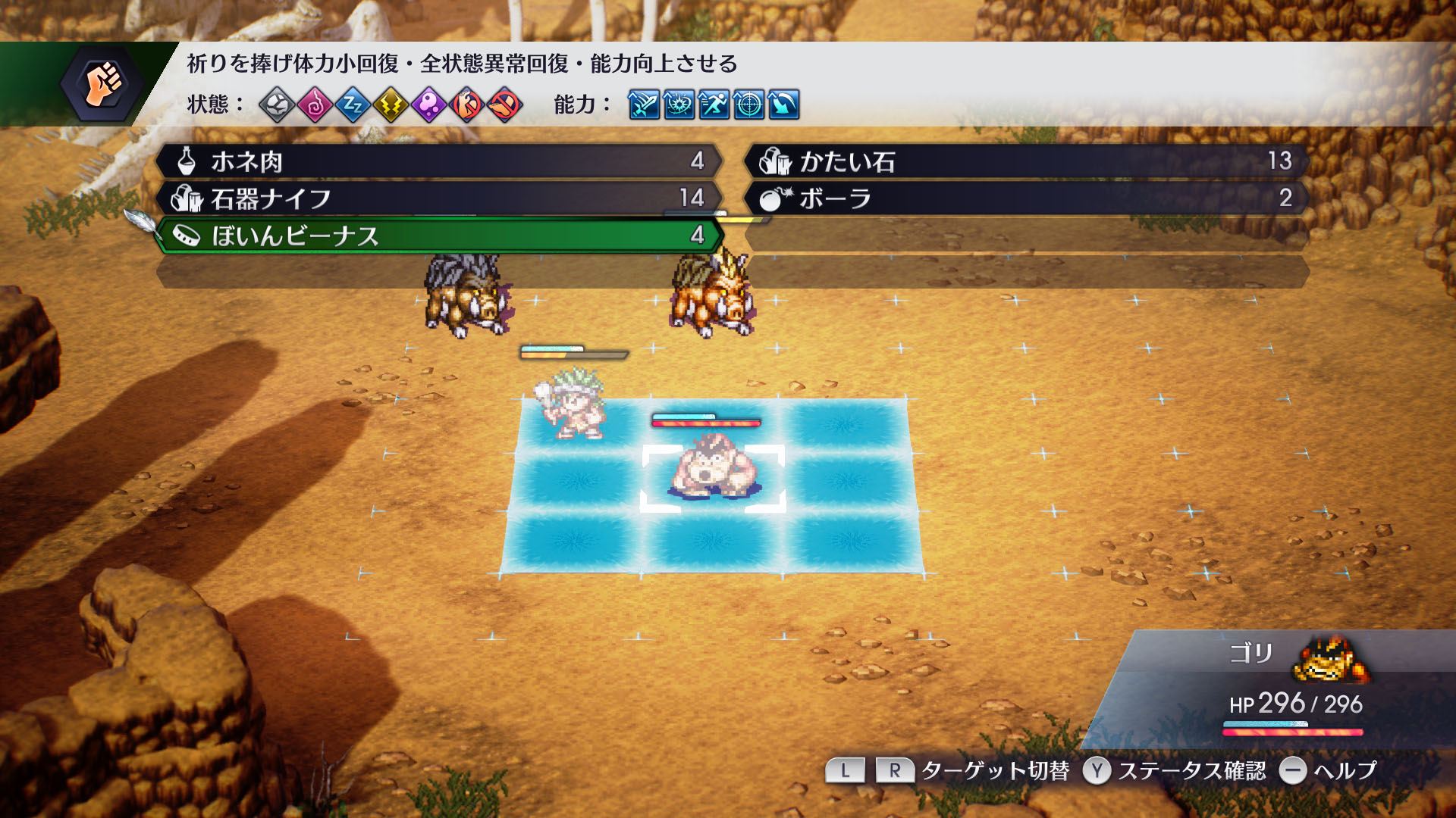 적이 많아 이동하기 어려울 때는 범위공격이 효과적이며, 회복기 중에는 상태 이상을 치료하는 것부터 자신의 스탯을 향상시키는 것도 있다.