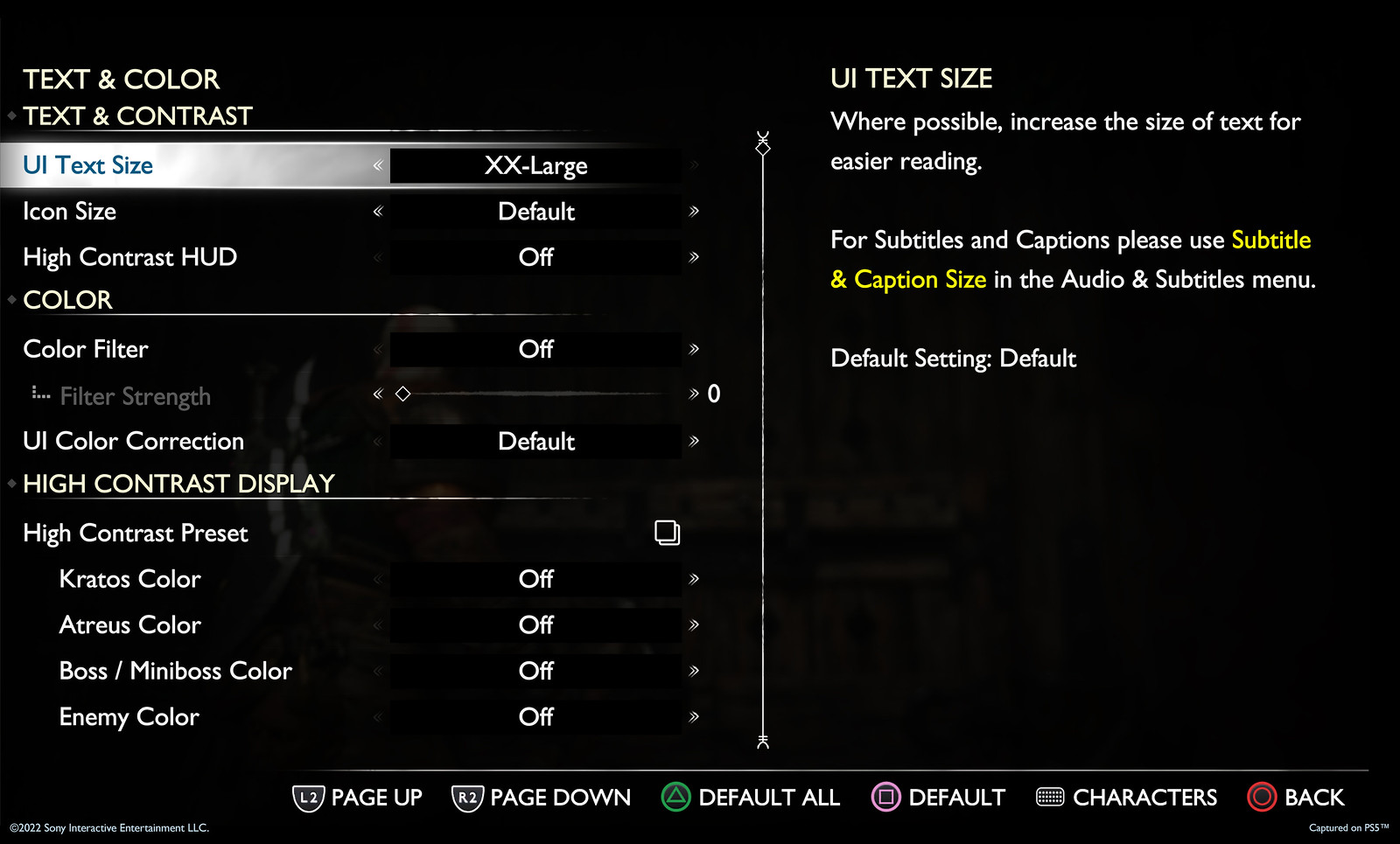 - UI 텍스트 크기 / 아이콘 크기 변경 가능 - 「갓 오브 워(2018)」에서 많은 요청을 받은 그 기능이 개선되서 돌아옵니다! 여러분이 소파에서 플레이할 때 편안한 독서 경험을 원한다는 것을 들었습니다. 완전히 재설계되고 응답성이 뛰어난 UI와 크게 확장할 수 있는 더 큰 최소 텍스트 크기를 통해 화면 상의 글자를 읽는 것이 훨씬 쉬워졌습니다.