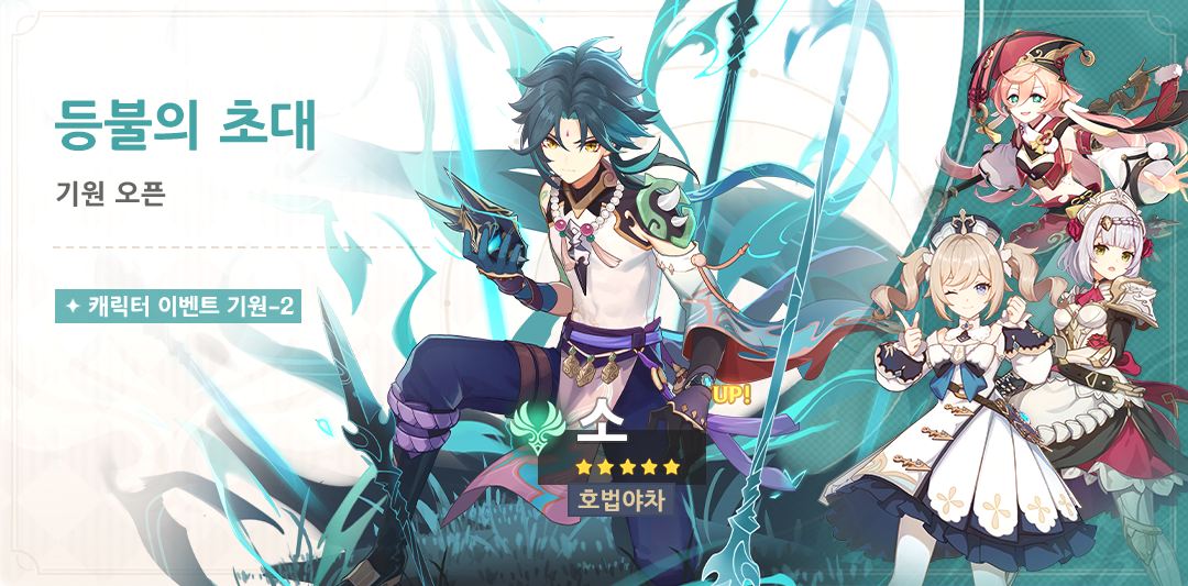 ★5 캐릭터「소(바람)」의 기원 획득 확률 UP ★4 캐릭터 「바바라(물), 「연비(불)」, 「노엘(바위)」의 기원 획득 확률 UP |